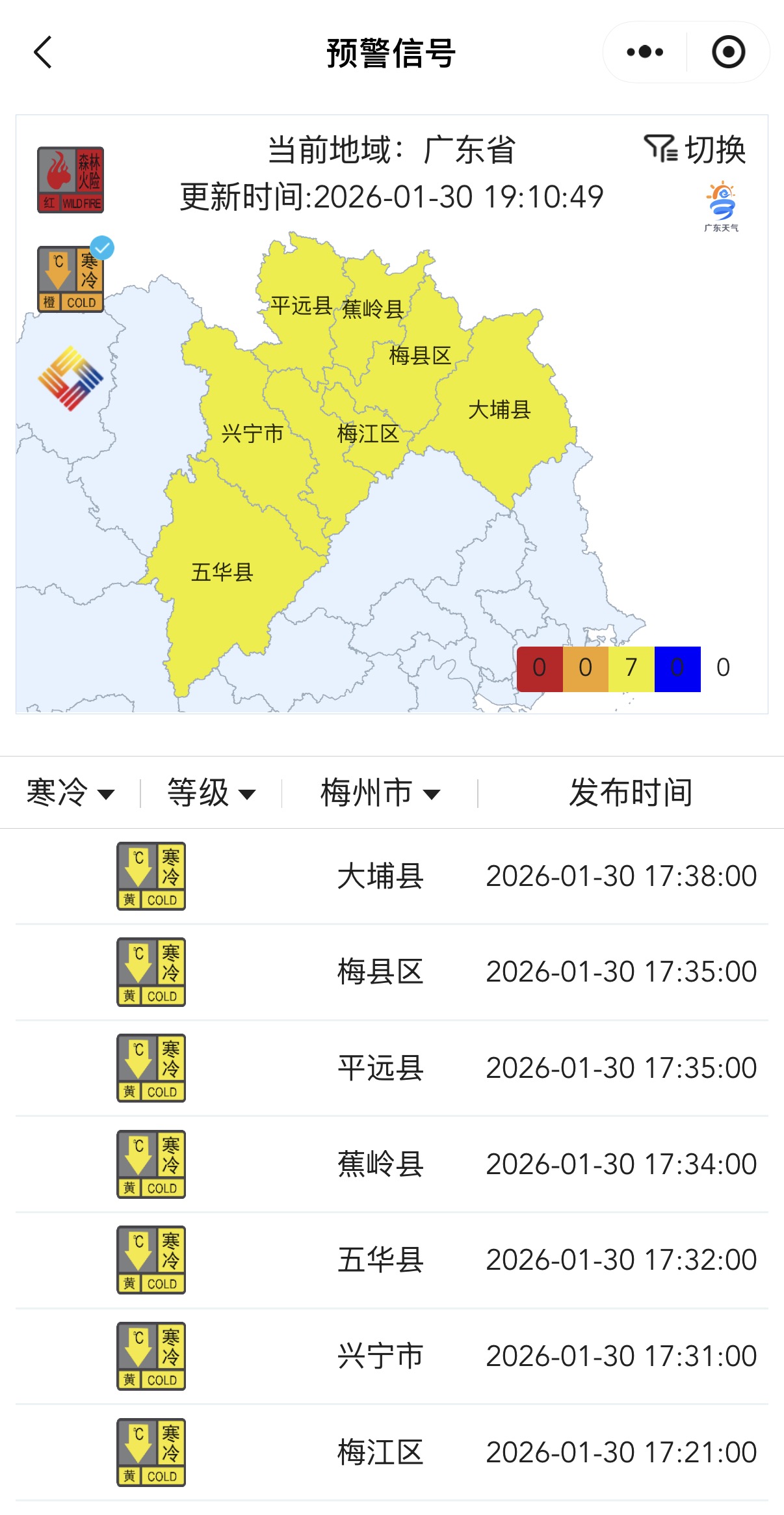 降温!梅州7个县(市、区)寒冷黄色预警信号生效 2026-01-30 19:19 6 掌上梅州讯 据@梅州天气微博消息,预计受冷空气影响,未来两天我市日平均气温将降至12℃左右。目前,除了丰顺县,其余7个县(市、区)的寒冷预警均为黄色。请注意做好防寒和防风工作,适时添衣保暖。 编辑:李舒宇 审核:练海林