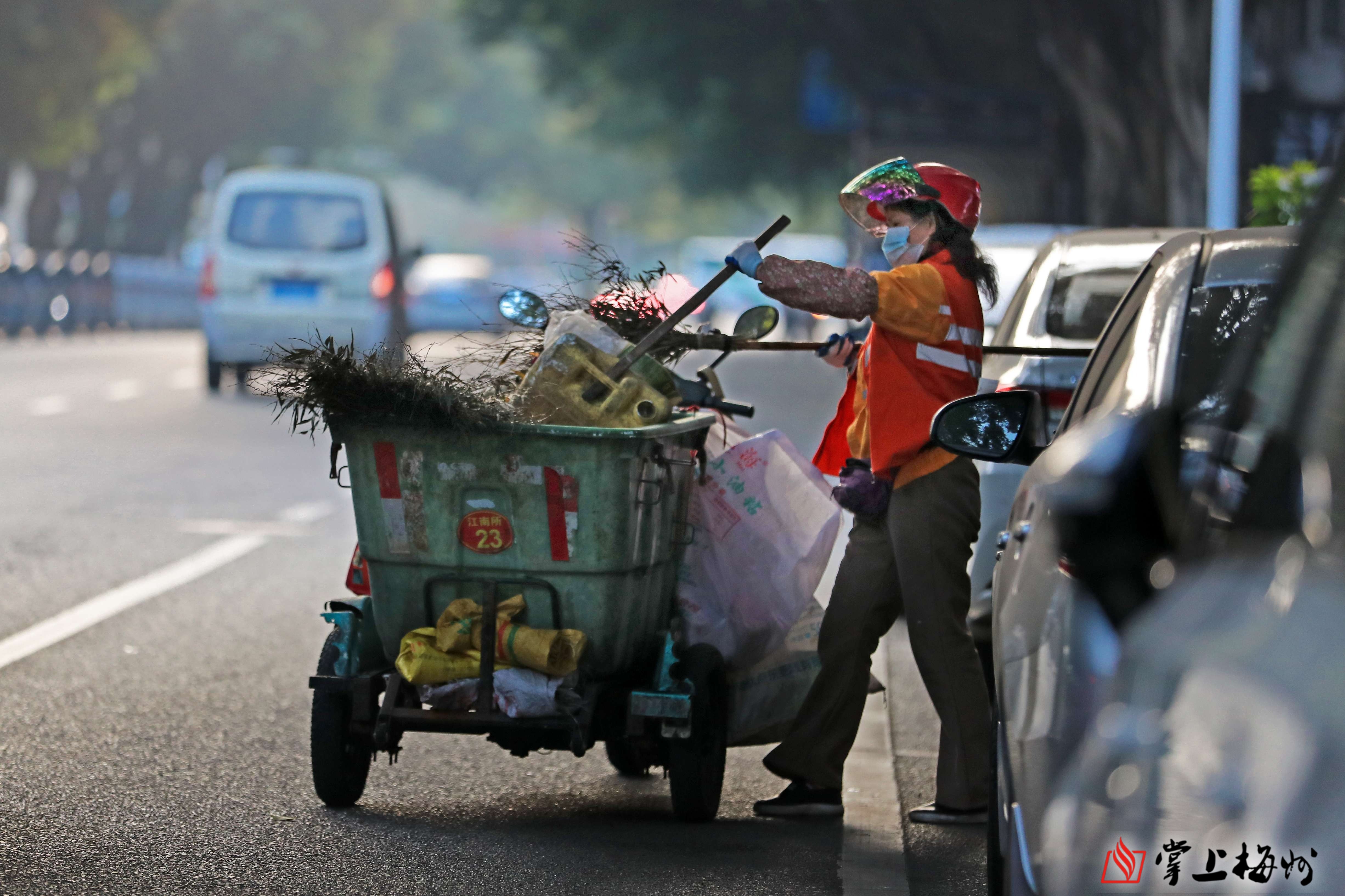 天刚亮,幽暗的街道上,环卫工人握着扫帚的身影缓缓移动,橘红色的工作服成了这片幽暗里最醒目的色彩。