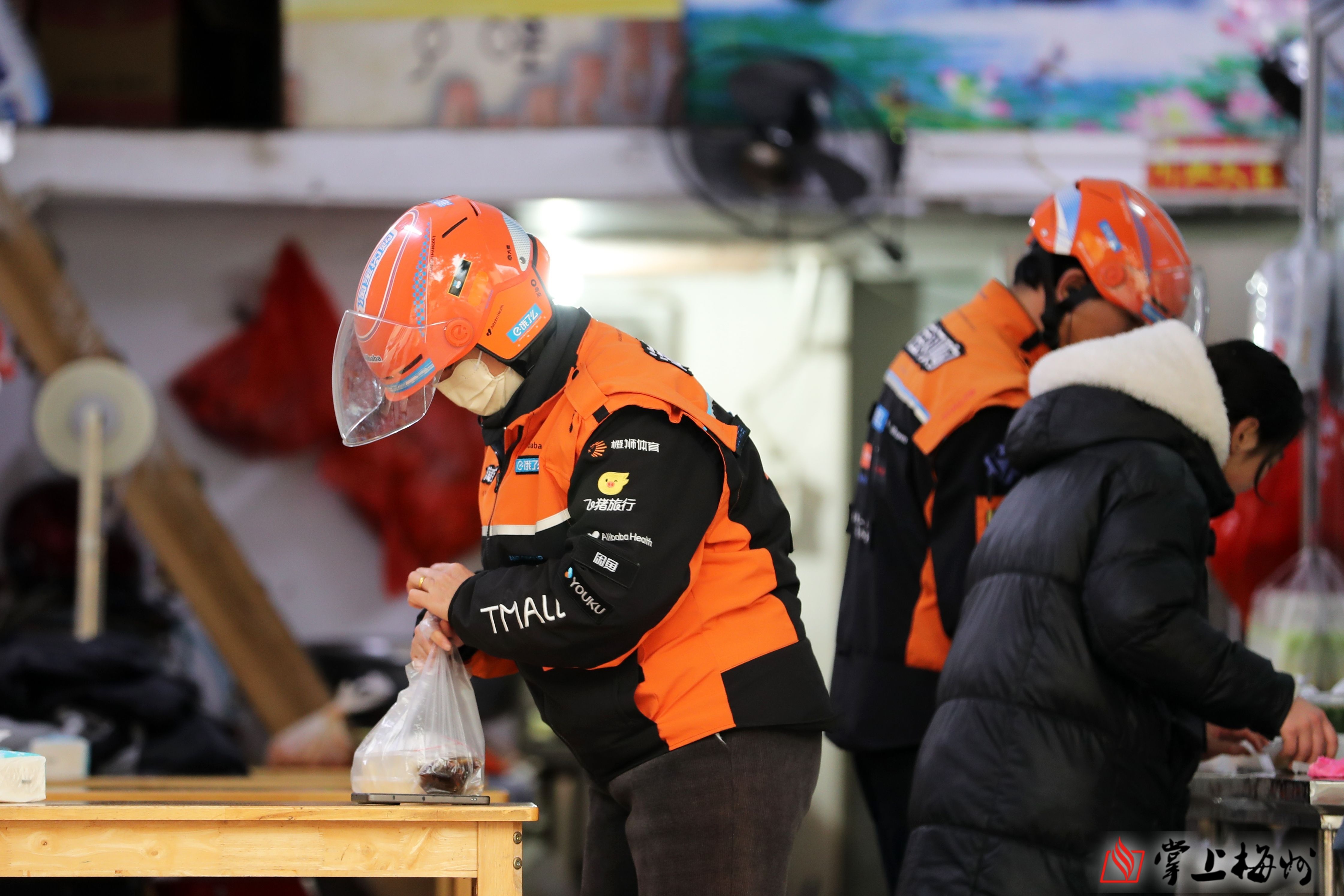 菜市场里,早餐店老板娘为早早出摊的摊贩送上热气腾腾的早餐,忙得不亦乐乎。