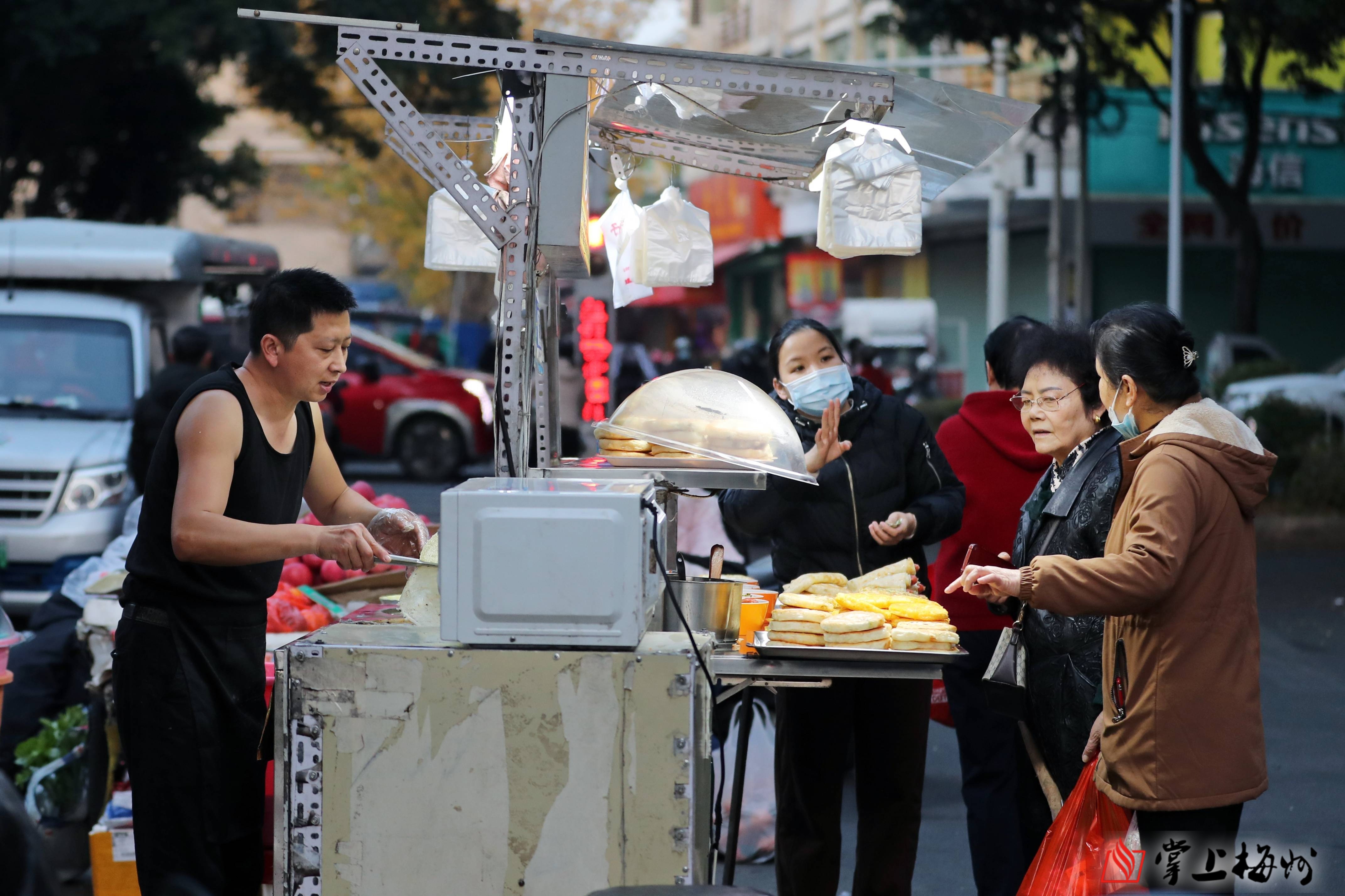天刚蒙蒙亮,市场边的煎饼摊已支了起来,穿着背心的小哥忙碌着,显得格外惹眼。