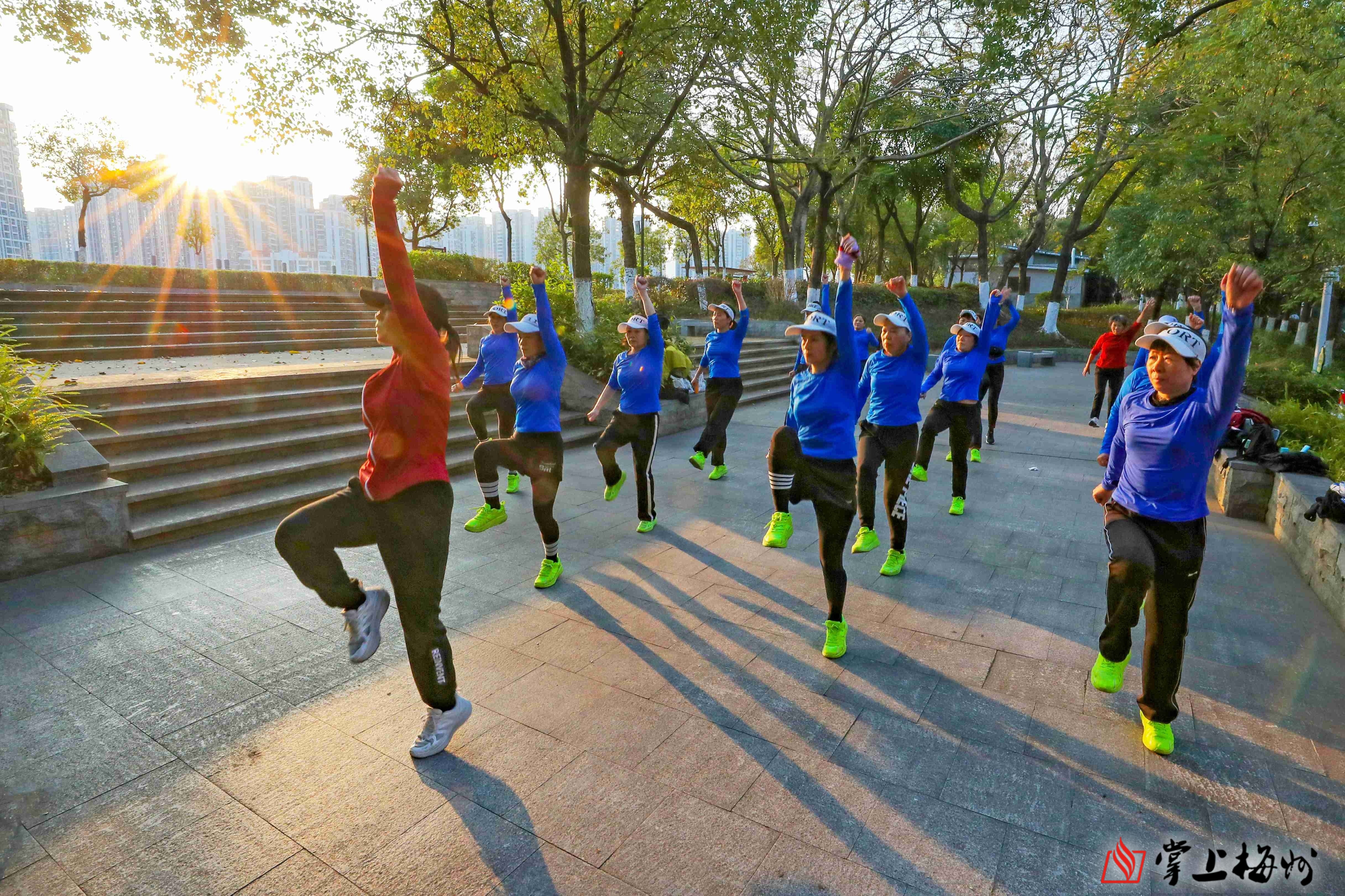 冬日清晨,初升暖阳放射金光,划破晨雾,照耀在一群热舞的人身上,暖意融融。