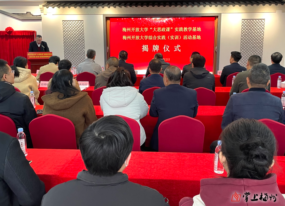 仪式上,在全场嘉宾的共同见证下,市教育局领导与双方单位核心负责人共同为两大基地揭牌。红绸落下,两块崭新的牌匾正式亮相,标志着梅州开放大学与尚学教育基地的合作迈入实质性阶段。