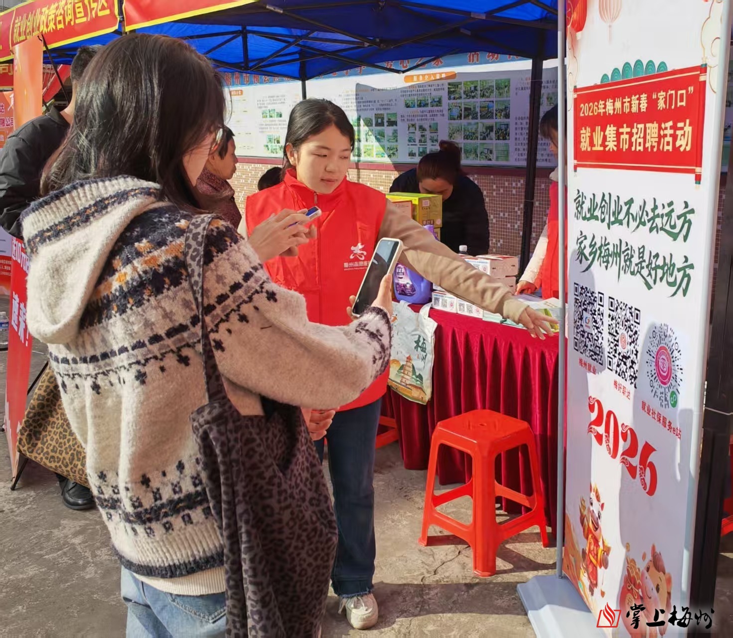 掌上梅州讯 就业创业不必去远方,家乡梅州就是好地方。2月9日,2026年梅州市城东镇新春“家门口”就业集市招聘活动在城东镇竹洋公学举行,21家企业入场招聘,提供600多个就业岗位,吸引周边市民前来咨询。