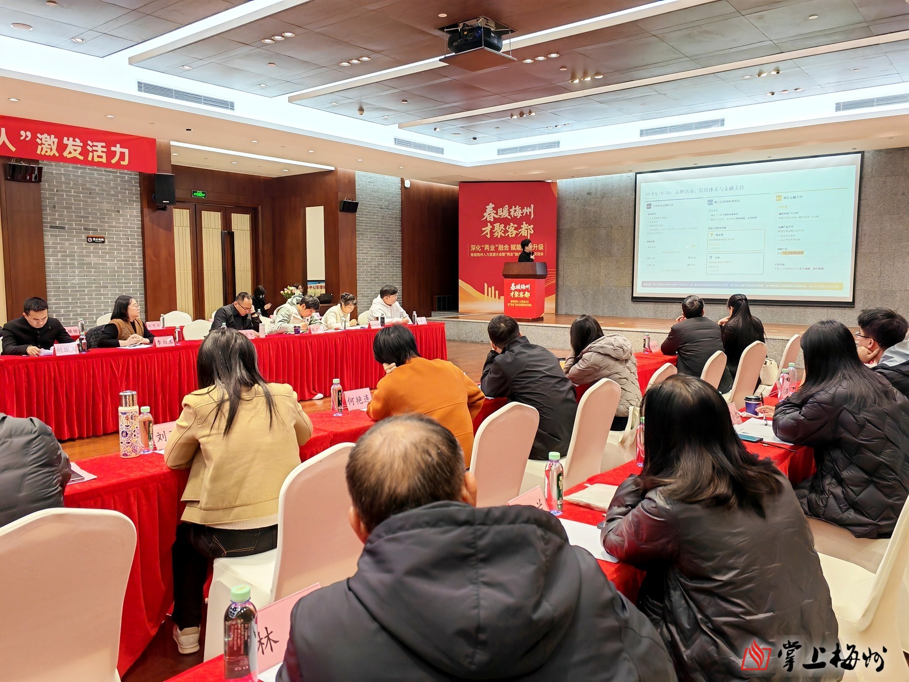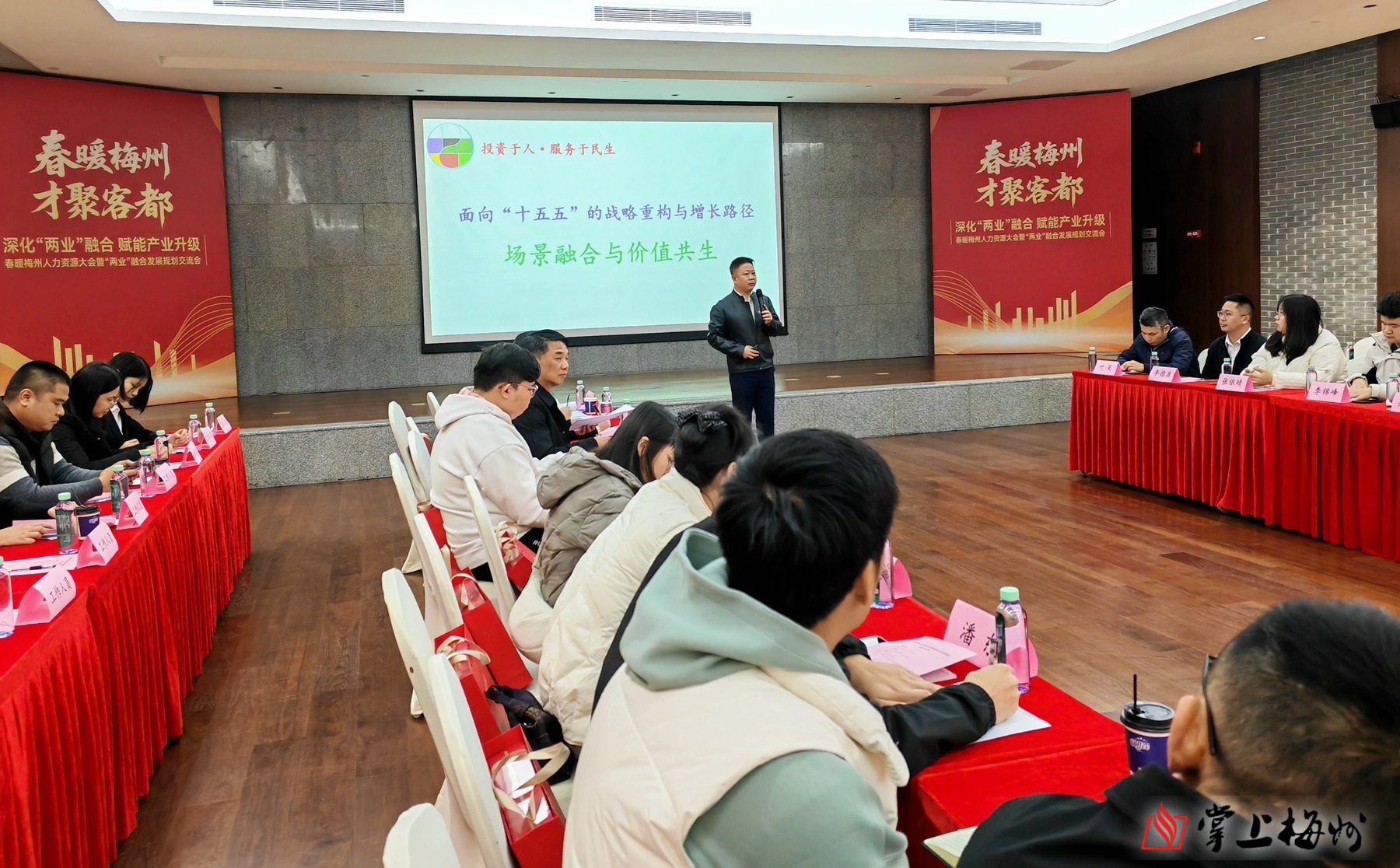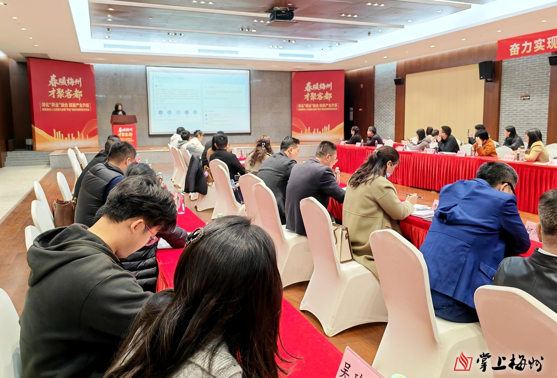 掌上梅州讯 2月10日,由市人力资源和社会保障局指导,市人力资源发展协会、市高层次人才协会主办的春暖梅州人力资源大会暨“两业”融合发展规划交流会在梅州市世界客商中心举行,市、县(市、区)人社部门相关负责同志,市人力资源发展协会会员代表,市人力资源服务产业园入驻企业代表、市重点制造企业人力资源负责人以及特邀讲师和嘉宾约80人参会。