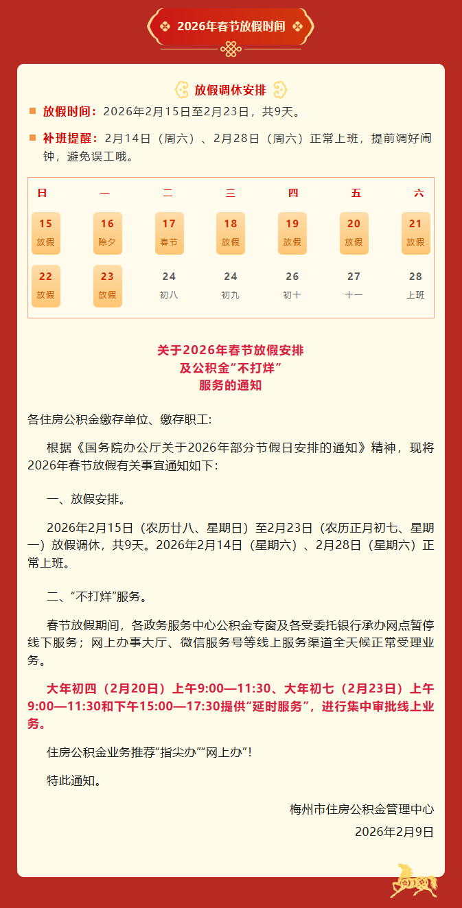 梅州公积金2026年春节放假安排及“不打烊”服务的通知来啦