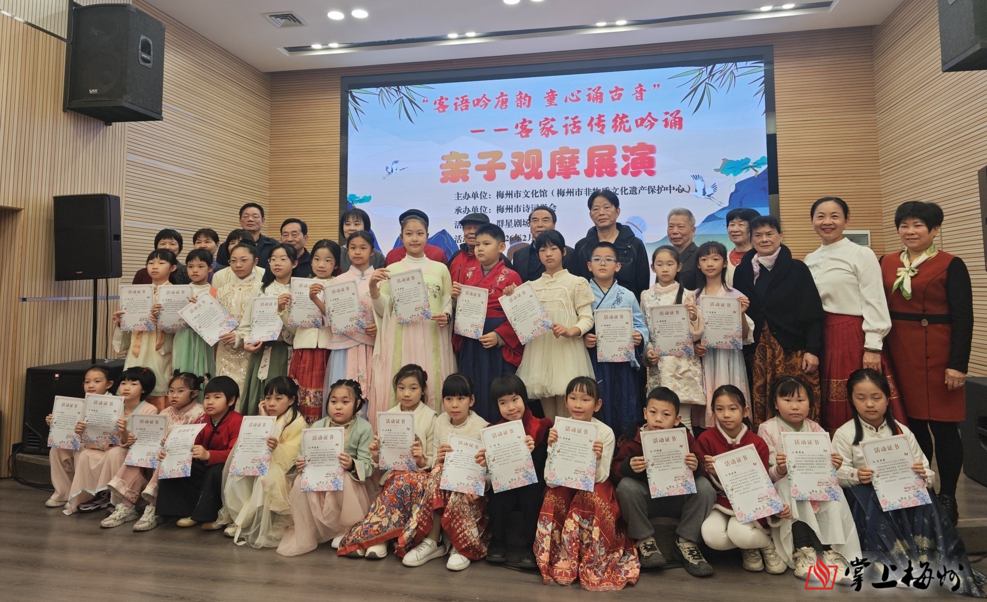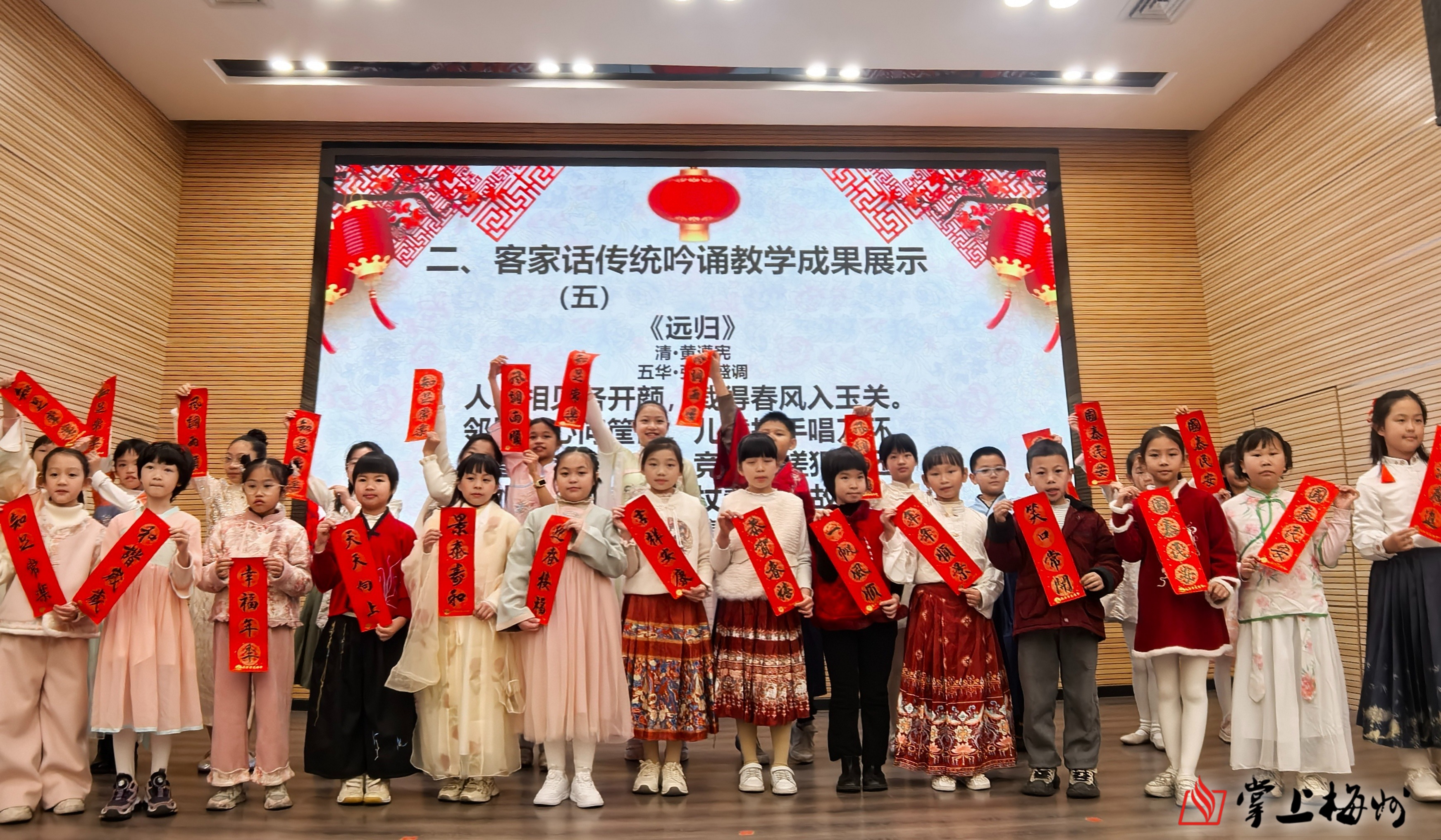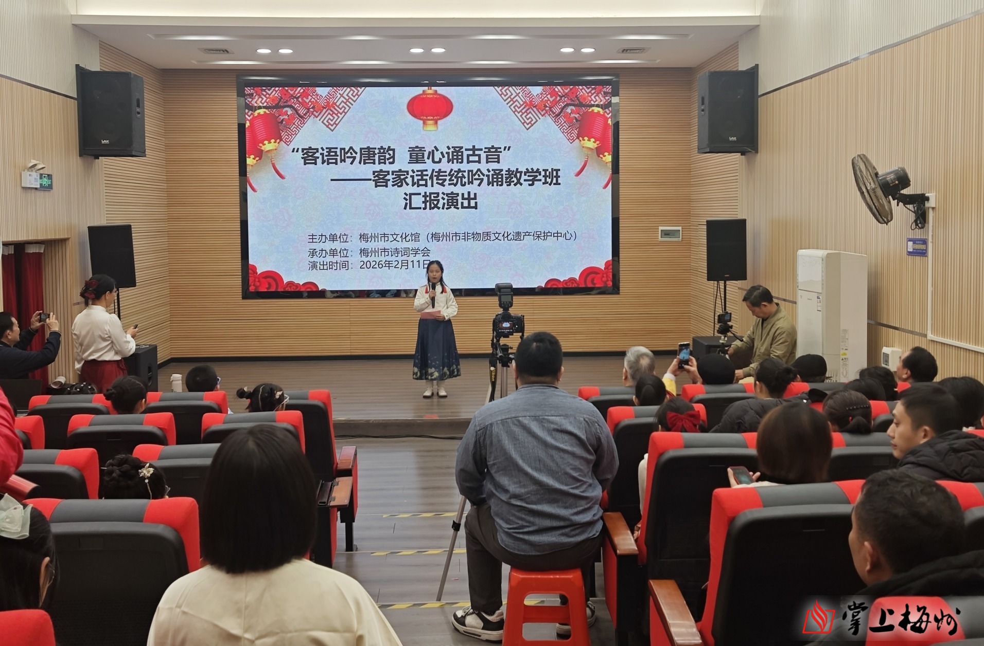 掌上梅州讯 2月11日,梅州市文化馆内余音绕梁,童声琅琅。为期十天的“客语吟唐韵 童心诵古音”客家话传统吟诵教学表演活动在此圆满落幕,为现场观众献上了一场融合乡音与诗韵的文化盛宴。