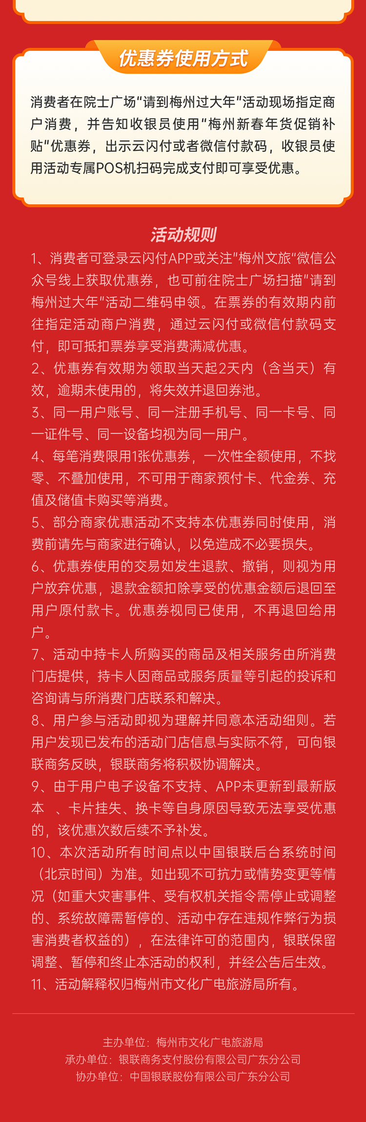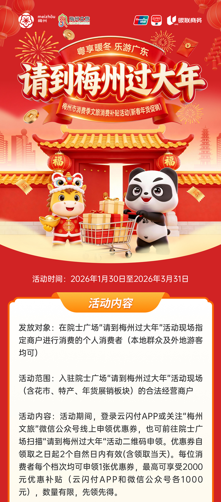 值得一提的是,1月30至3月31日,梅州还将同步开展梅州市消费季文旅消费补贴活动(新春年货促销),在院士广场“请到梅州过大年”活动现场指定商户进行消费的个人消费者均可申领优惠券,最高可享受2000元优惠补贴。