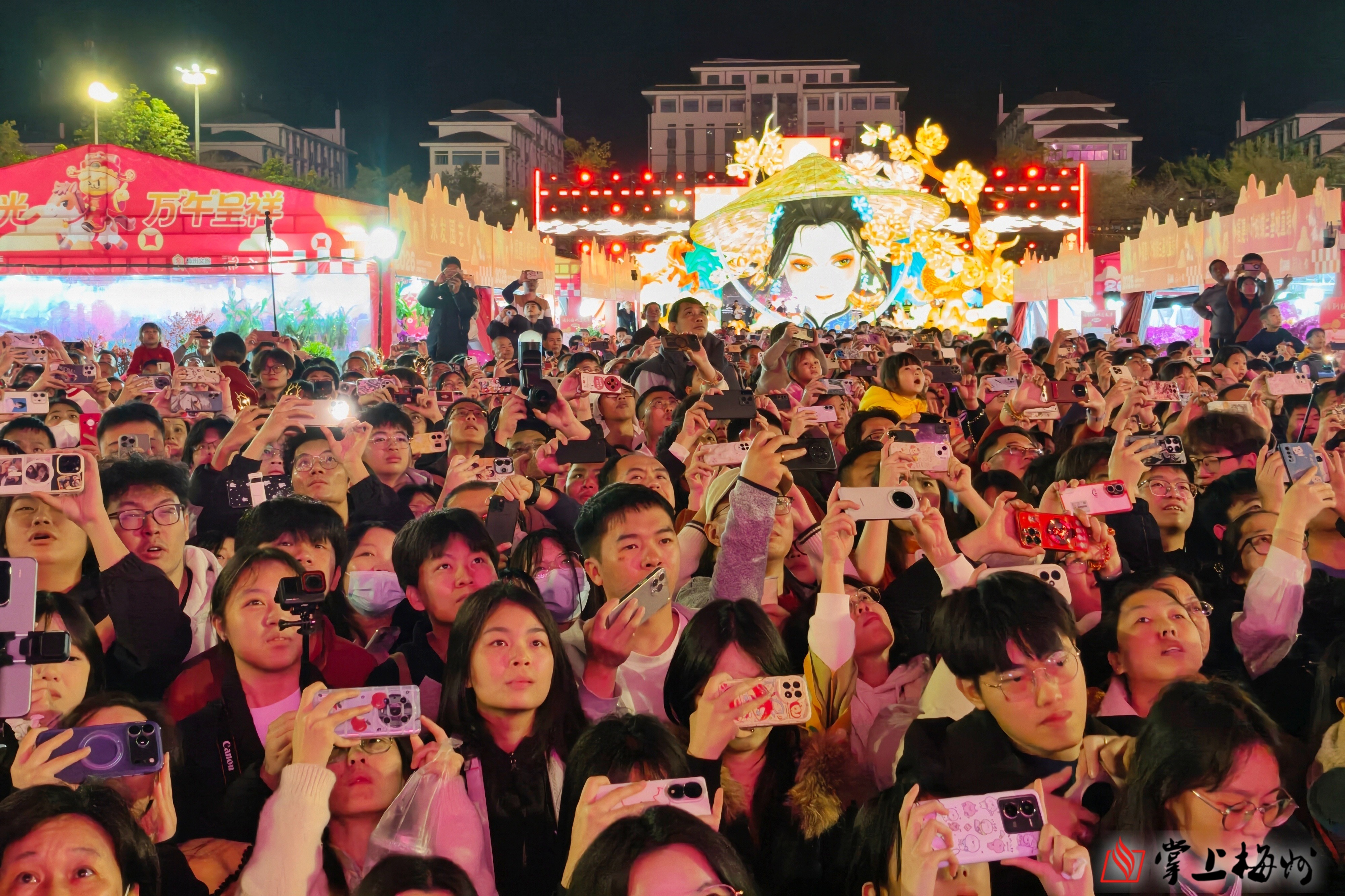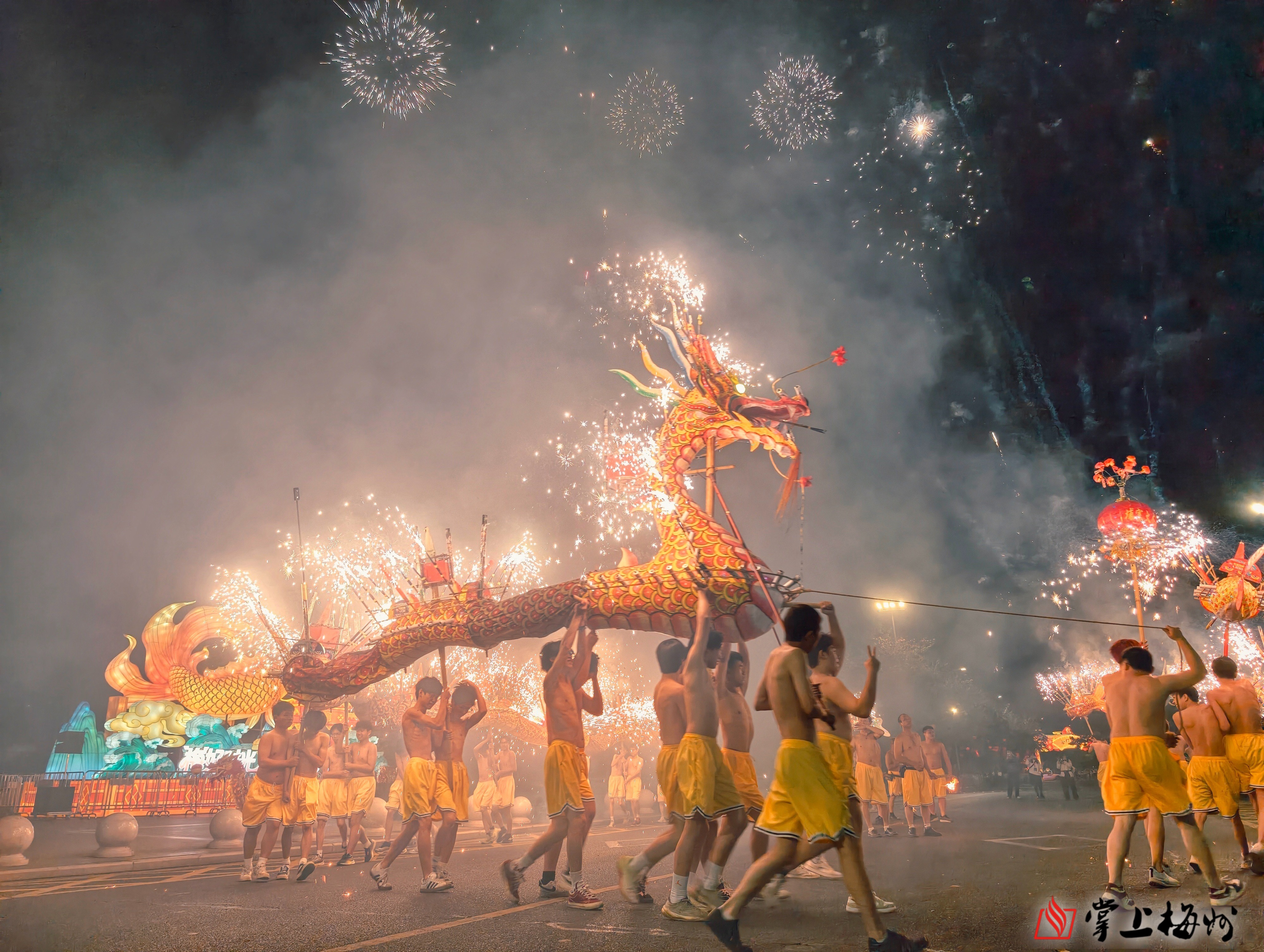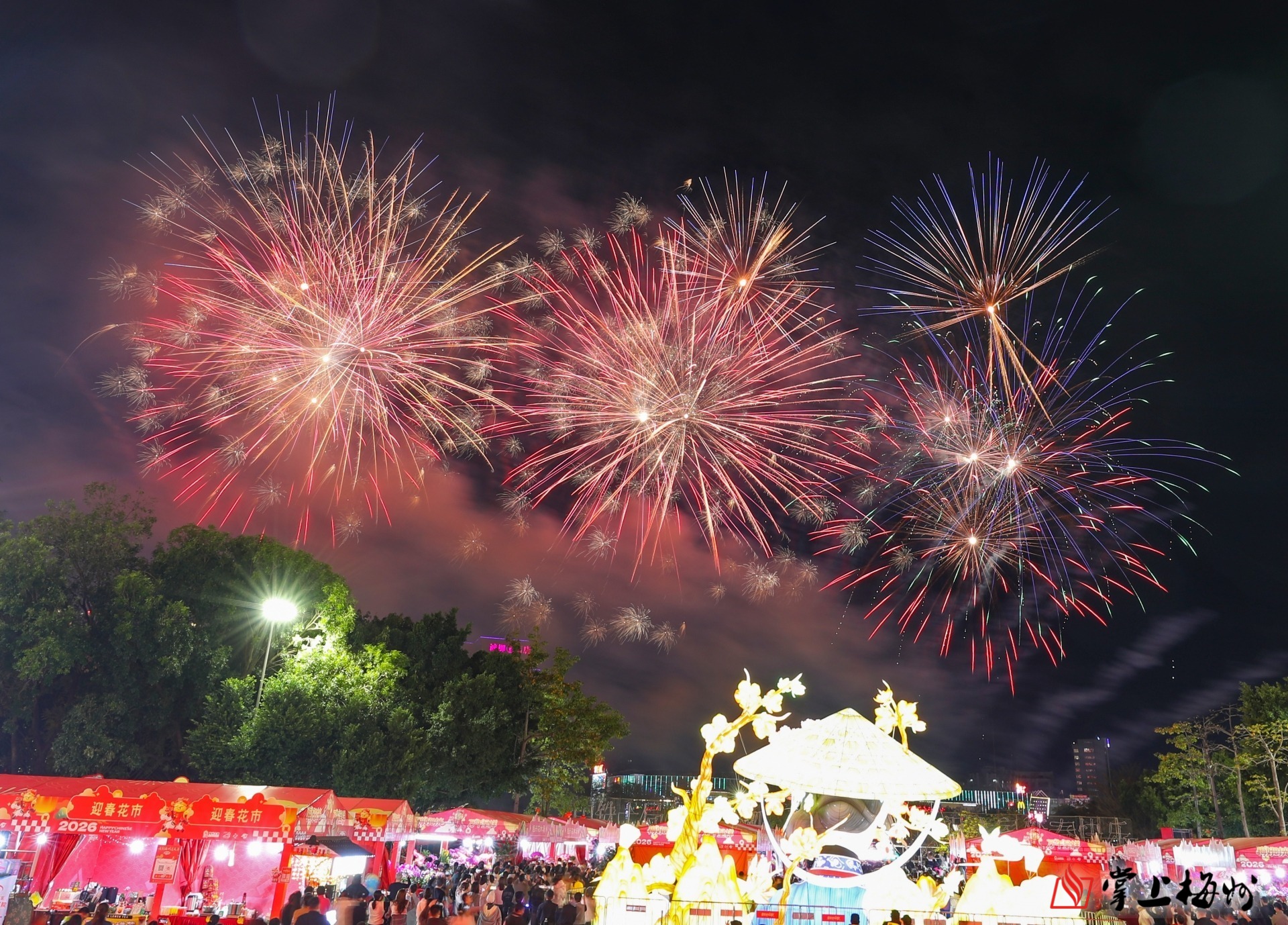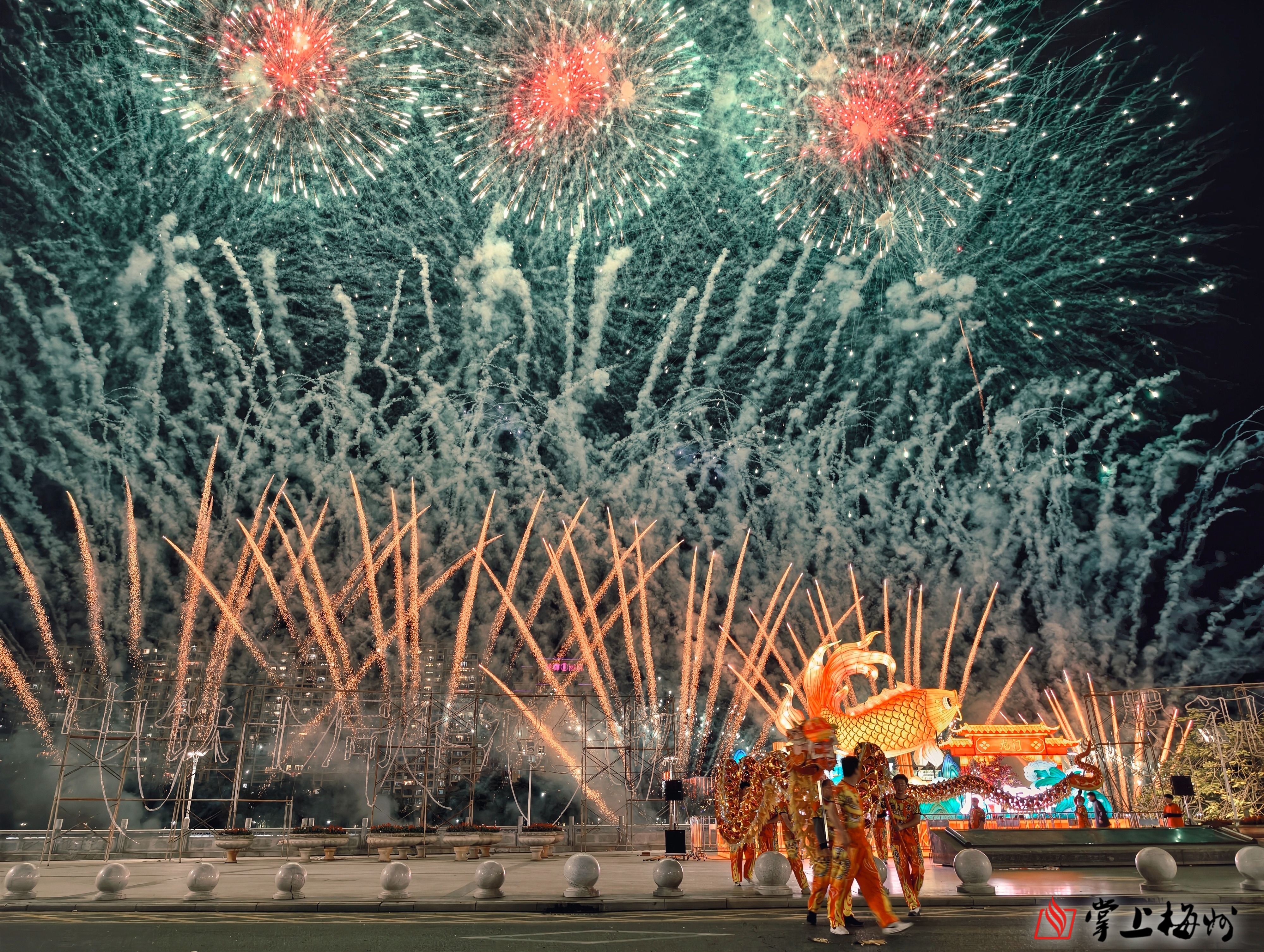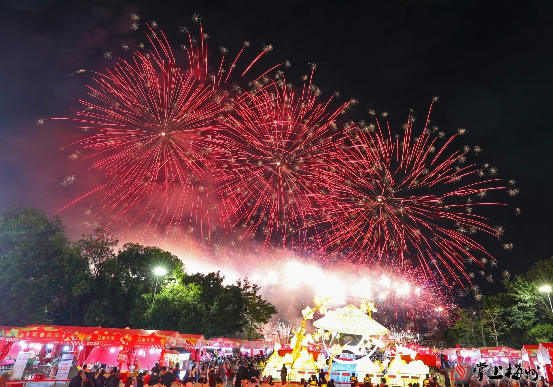 启动仪式现场,领导嘉宾按下启动键,共同启动“请到梅州过大年”系列活动。全场观众同时点亮手中的迎春花灯,与新春灯会的“梅州女神”主题灯组、“鲤鱼跃龙门”“龙马精神”“锦鲤通道”等特色灯组一起,构成了一幅融合客家文化与现代光影的绚丽画卷。随后还举行了国家级非遗“烧火龙”表演和大型烟花秀,两条火龙依次登场携火花穿梭腾跃,璀璨艳丽的烟火一次次点亮夜空,为广大市民游客呈现了一场精彩的视觉盛宴。