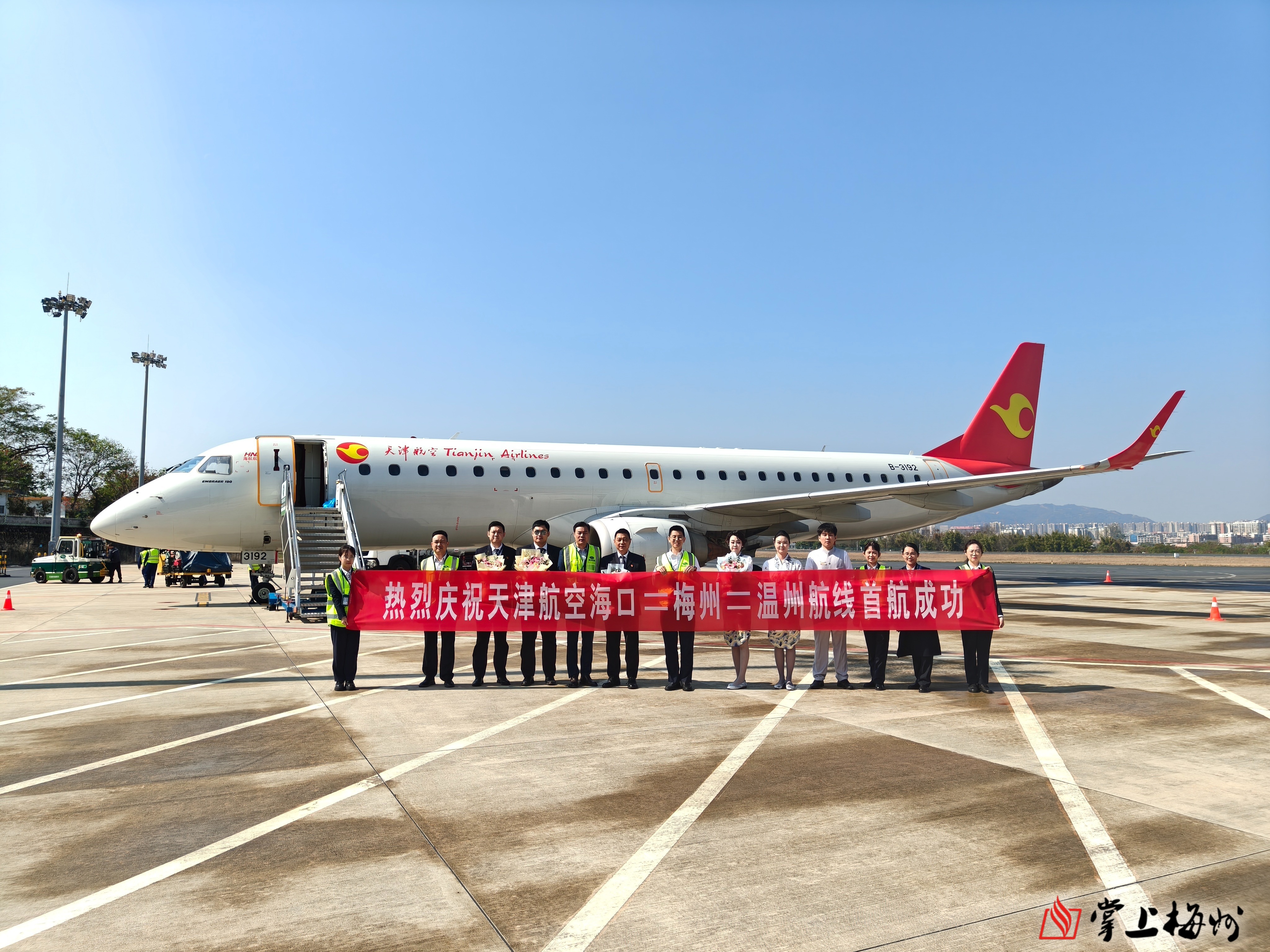掌上梅州讯 2月12日10时46分,随着天津航空GS6553航班平稳降落在梅州机场,标志着“海口=梅州=温州”航线首航成功。该航线也是梅州机场2026年开通的首条新航线。