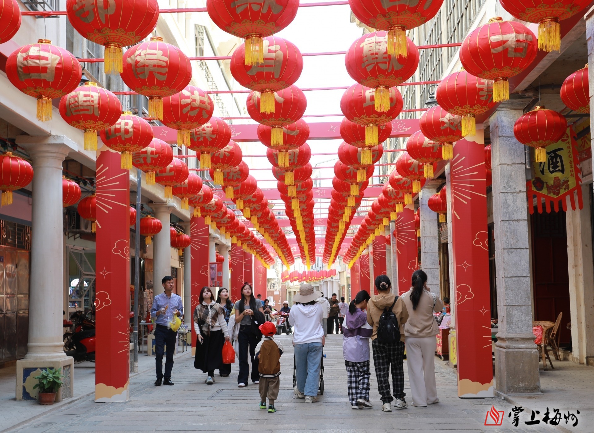 梅江区嘉应古城骑楼沿街的灯笼、纸伞高高悬挂,洋溢着浓厚的年味。(连志城 摄)