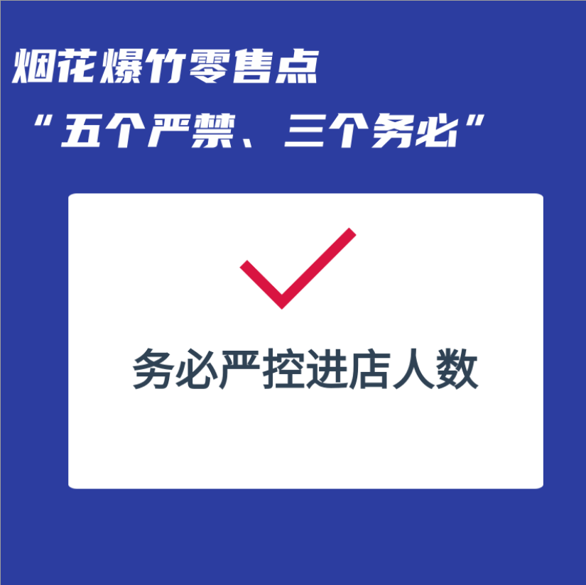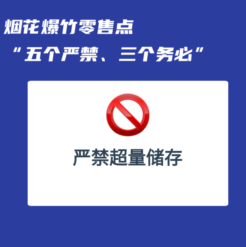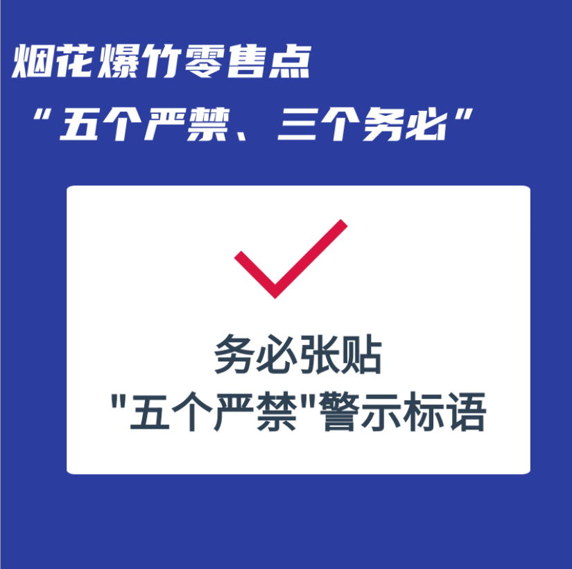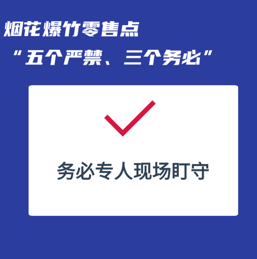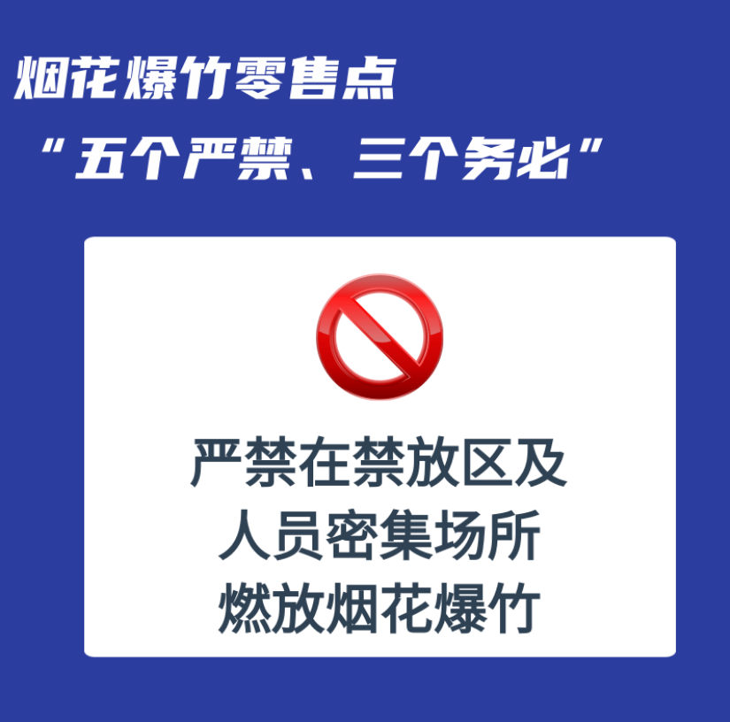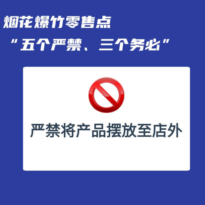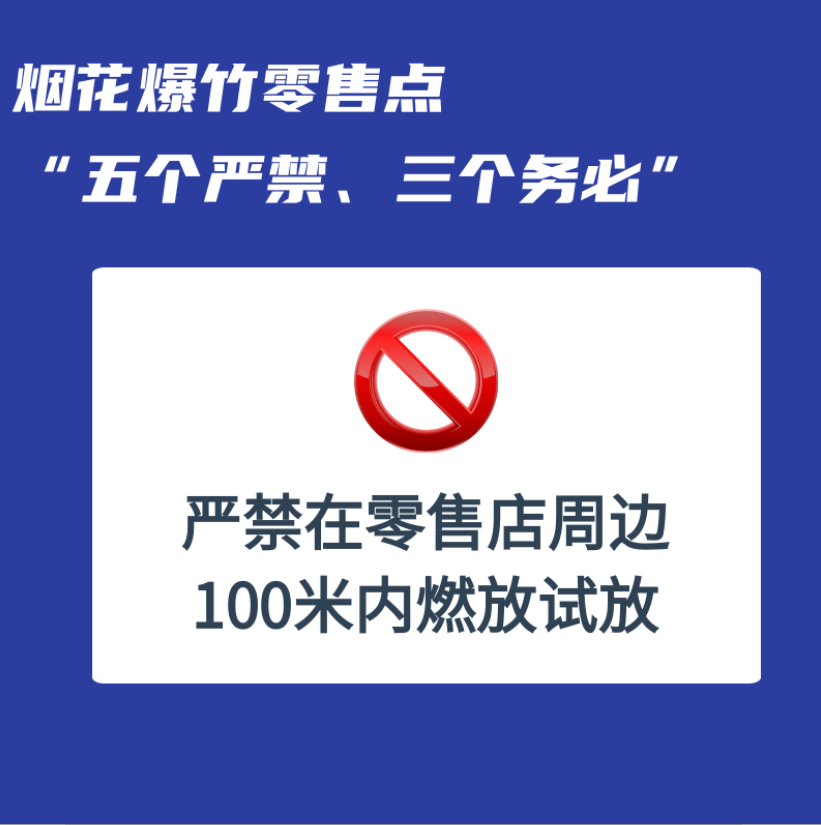 我市作为烟花爆竹销售大市,当前至元宵节期间零售店依然营业,特别是兴宁、五华赏灯民俗活动、丰顺埔寨烧火龙活动等群众燃放活动仍然集中。市安委办提醒,各县(市、区)、各有关部门要针对当前存在的突出问题和风险隐患,对所有零售店“过筛子”检查,再次组织开展烟花爆竹零售店安全专项检查,特别是强化零售店(点)及其周边安全风险管控,严格执行“五个严禁”(严禁“下店上宅”、严禁超量储存、严禁将产品摆放至店外、严禁在零售店(点)周边100 米内燃放试放、严禁在禁放区及人员密集场所燃放烟花爆竹),落实“三个务必”(务必专人现场盯守、务必严控进店人数、务必张贴“五个严禁”警示标语),严查零售场所安全条件,严防各类风险失控引发意外。