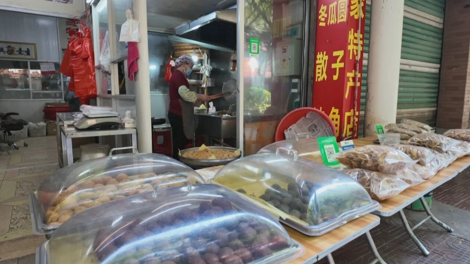 福妹芋圆店李福英:“每年春节都还可以,红糖姜圆、艾圆、煎圆都比较好卖,这些都是我们自己制作,自创的(做法),顾客来买了都说好吃。”