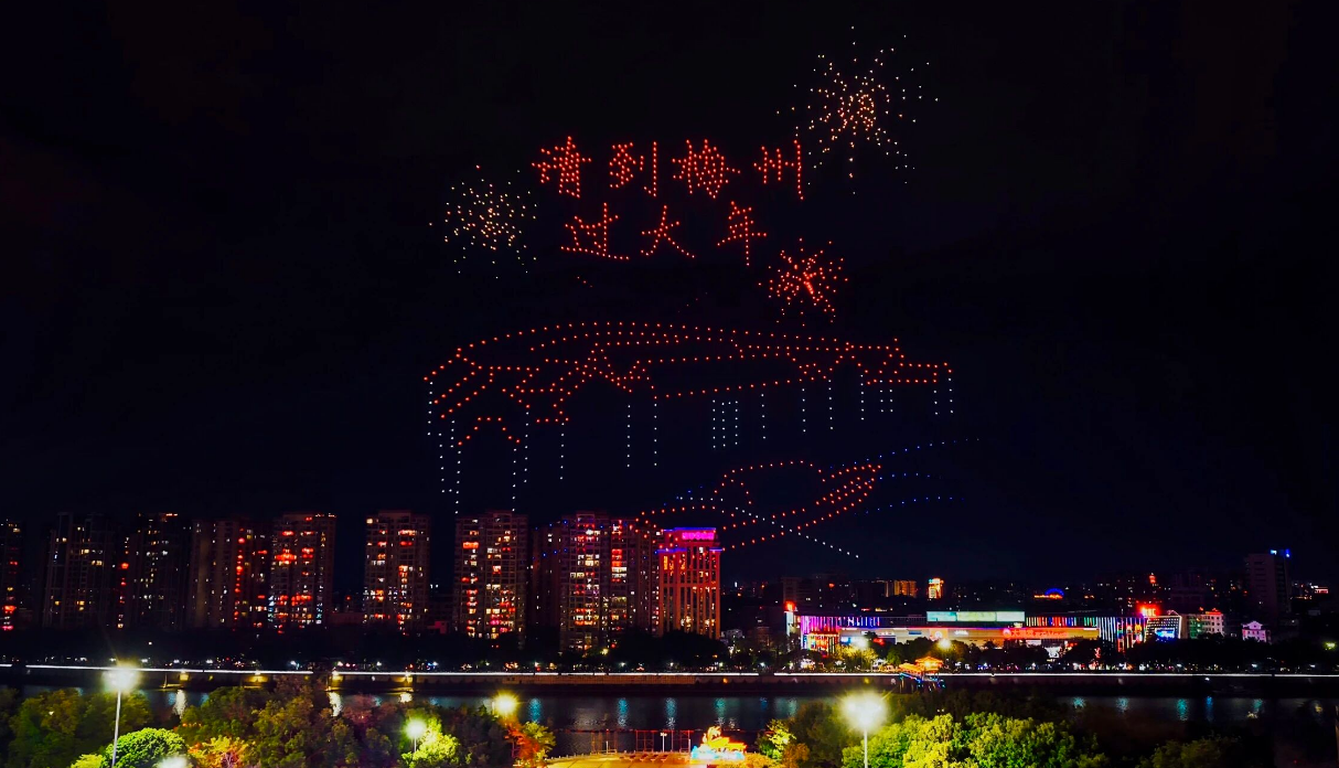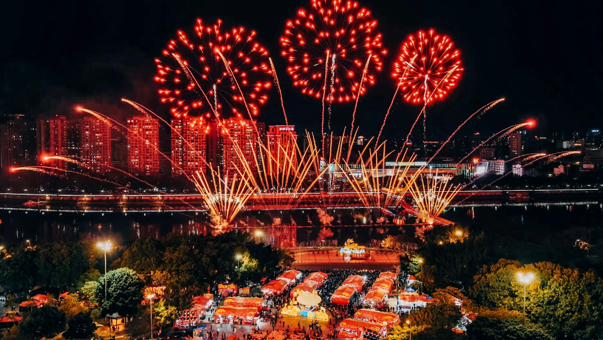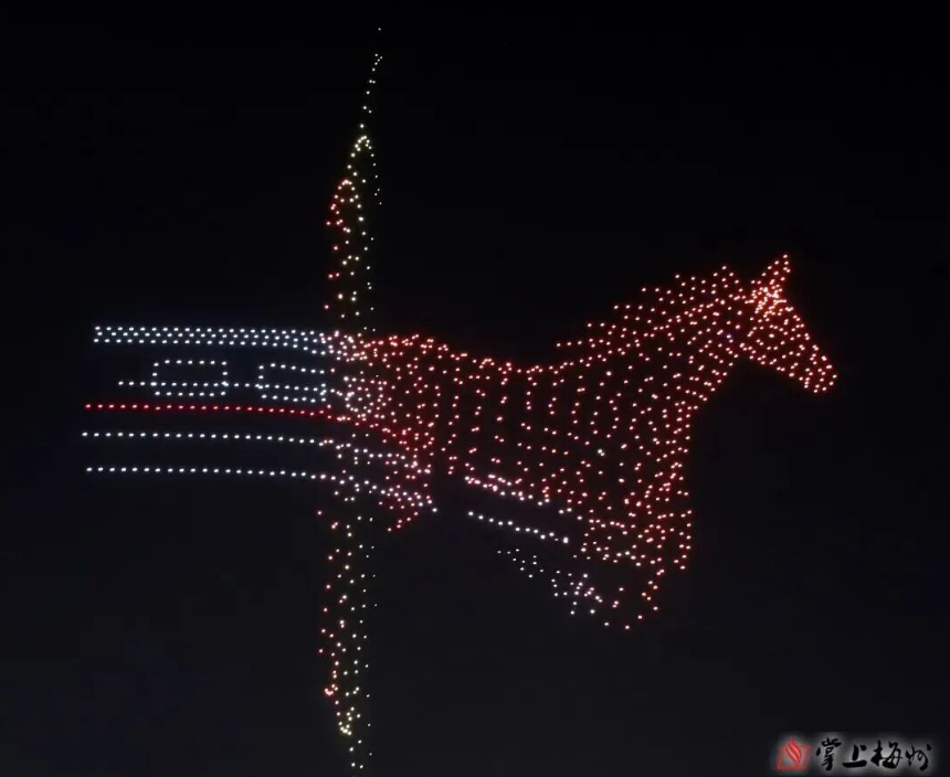 当客家古韵遇上现代科技,年味更添炫酷与温情。1200架无人机接连五晚,在梅江夜空徐徐铺展极具客家特色与马年寓意的光影画卷绘就马年吉祥、客都盛景:梅花竞相开放演变为”梅”好时光字样,高铁穿过漩涡之门,骏马奔腾而出,围龙屋前小船轻渡,”请到梅州过大年"随烟花绽放。这场科技与美学交融的空中盛宴,让市民游客举起手机、惊叹连连。大年初二晚,金红烟花点亮天际,银蓝流光漫卷长空,每一簇绽放都饱含“马到成功”的美好祈愿,演绎着客都的温情与盛景。省内首发的创意烟花轮番亮相,蓝色流星雨、“紫气东来”、黄金瀑布、蝶舞飞花等造型交相辉映,照亮梅江夜空与市民游客的幸福脸庞。