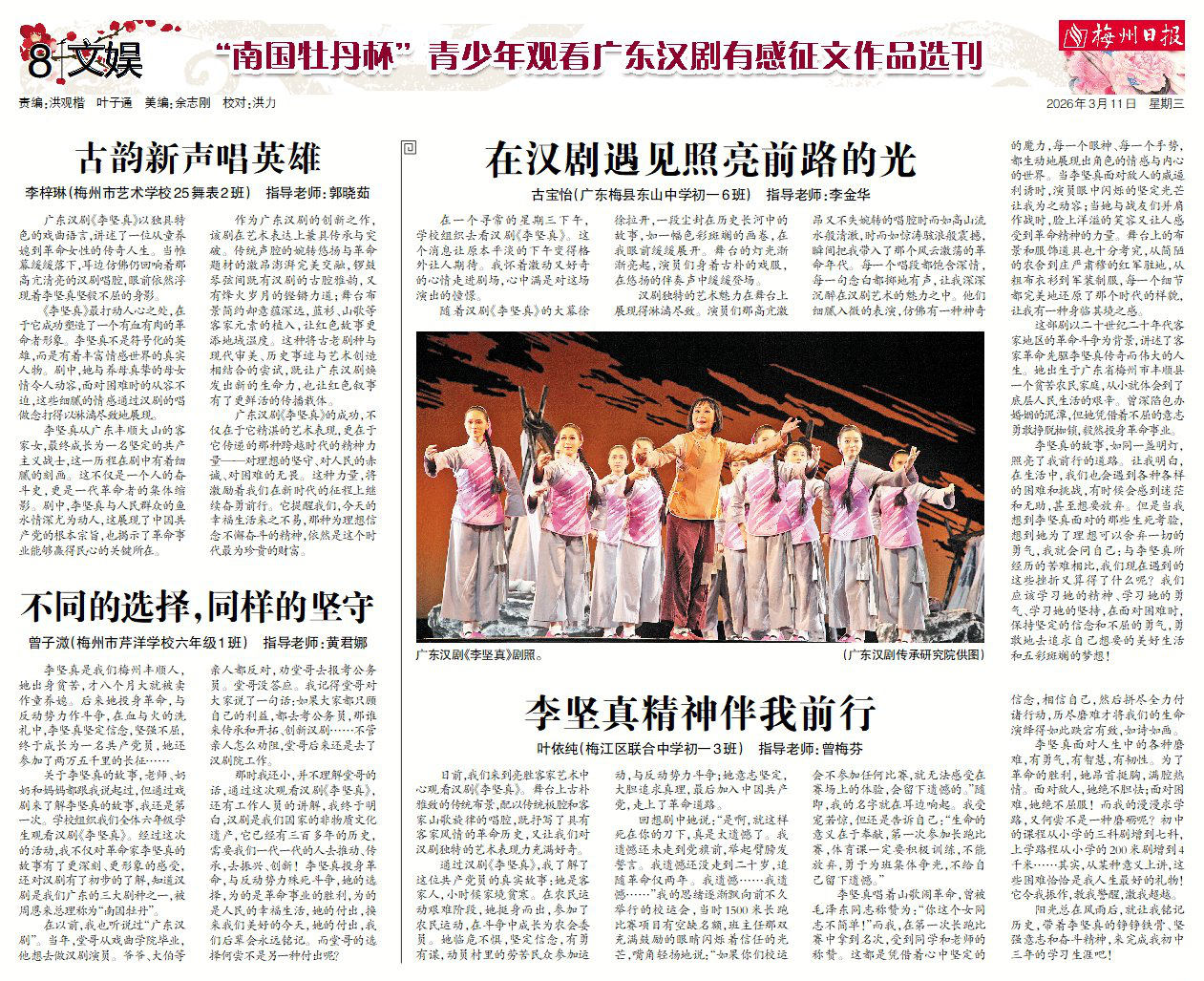关于李坚真的故事,老师、奶奶和妈妈都跟我说起过,但通过戏剧来了解李坚真的故事,我还是第一次。学校组织我们全体六年级学生观看汉剧《李坚真》。经过这次的活动,我不仅对革命家李坚真的故事有了更深刻、更形象的感受,还对汉剧有了初步的了解,知道汉剧是我们广东的三大剧种之一,被周恩来总理称为“南国牡丹”。