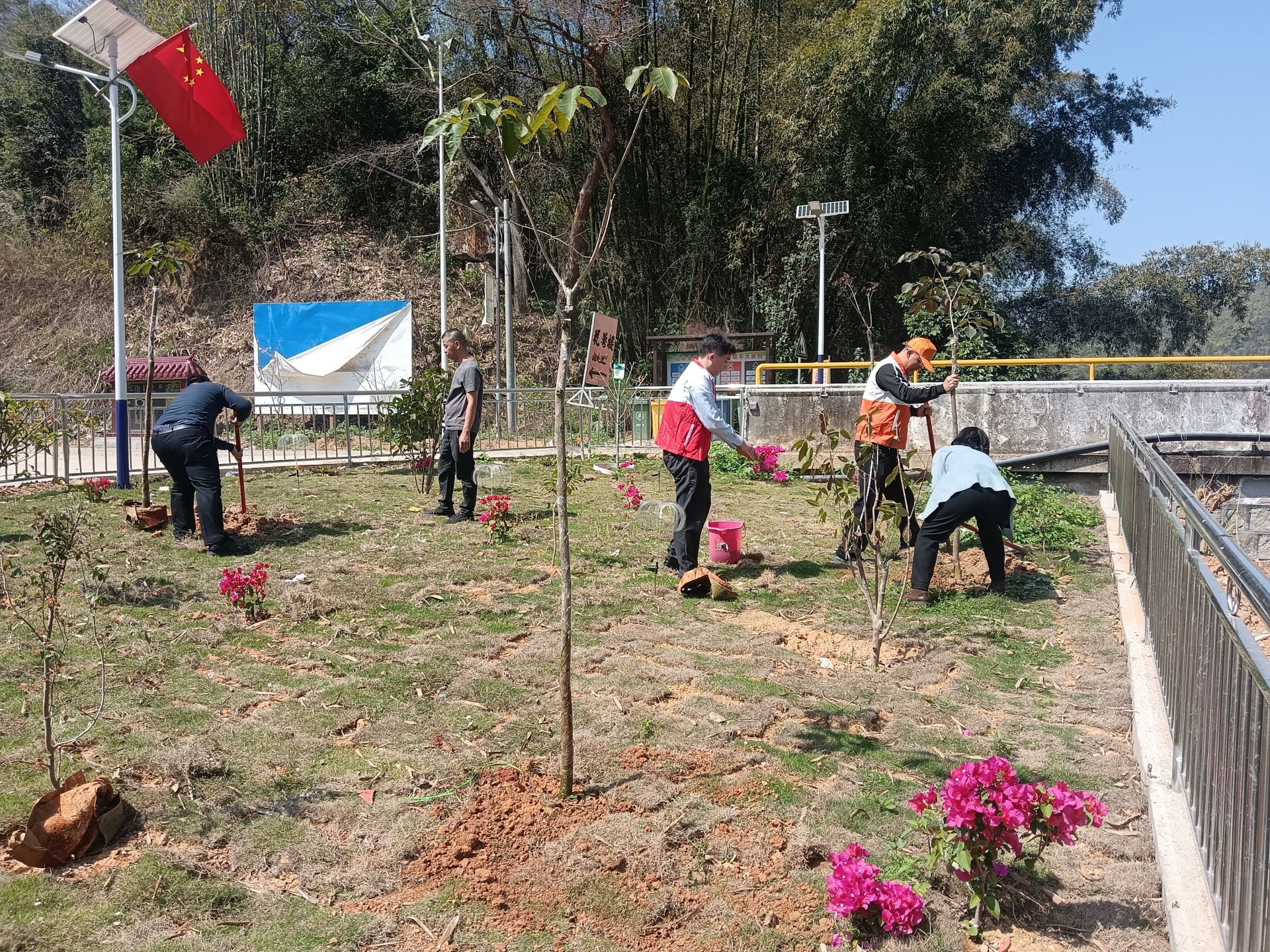 在大东镇联丰村的植树造林现场,市供销合作社机关支部和企业支部党员,连同中国农业银行梅州分行、广东天禾第九(梅州)党支部、大东镇村党员干部一行热情高涨,大家分工合作、挥锹铲土、填坑浇水,有条不紊地完成植树造林的每一道工序,共种下紫花风铃木100多株,广东天禾第九(梅州)党支部现场还捐赠了一批植树造林肥料,以“党建红”引领“生态绿”,推动“绿美梅州”生态建设。