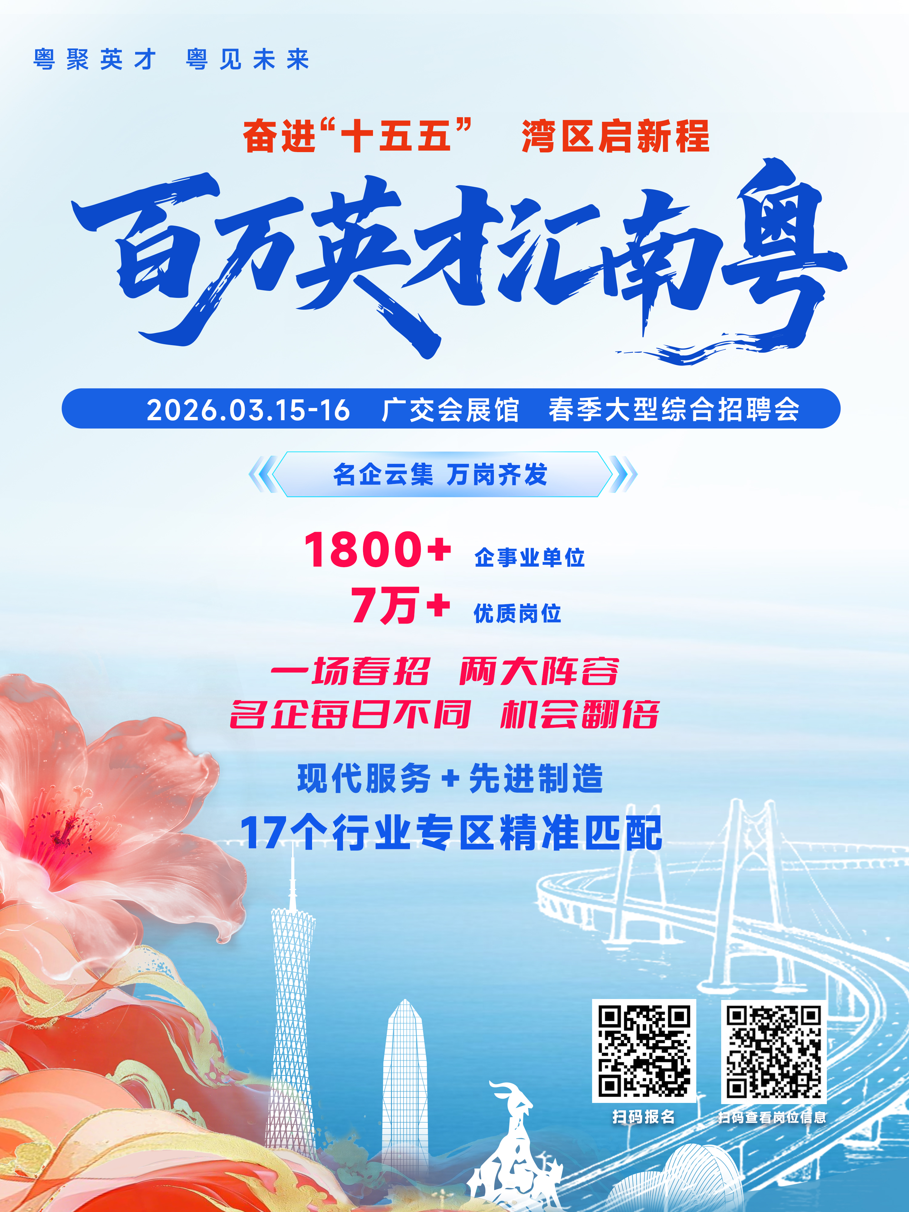 掌上梅州讯 记者近日获悉,3月15日至16日,“百万英才汇南粤”2026年春季大型综合招聘会将在广州广交会展馆D区17.1、17.2展馆举办,组织超1800家用人单位提供逾7万个优质岗位。其中,梅州精心组织23家企事业单位线下线上同步揽才,推出558个优质岗位,以满满诚意邀约广大英才共绘苏区振兴发展蓝图。