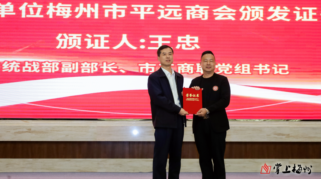 活动期间,王忠为承办单位梅州市平远商会颁发证书,感谢其对本次活动的全力支持与精心筹备。梅州市平远商会会长林海上台接受证书。