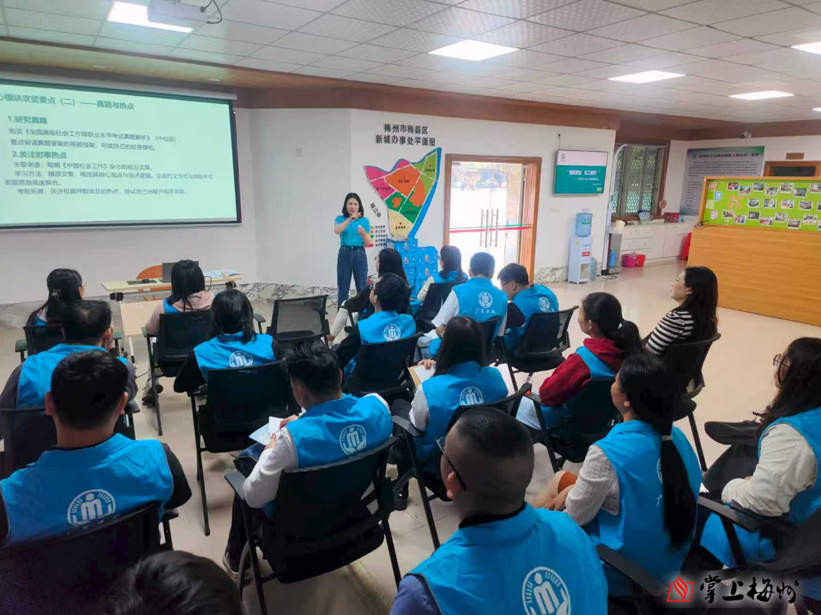宣传活动结束后,“双百工程”社工能力提升专题培训班在梅县区新城办社工站正式开班。培训聚焦社工心理健康与压力管理、个案服务实操技巧、高级社工师职业资格考试备考要点三大核心内容,立足基层社工实务需求,强化专业能力训练,进一步提升全市社工队伍理论素养与实操能力,为社工队伍提质扩容、长效发展夯实基础。