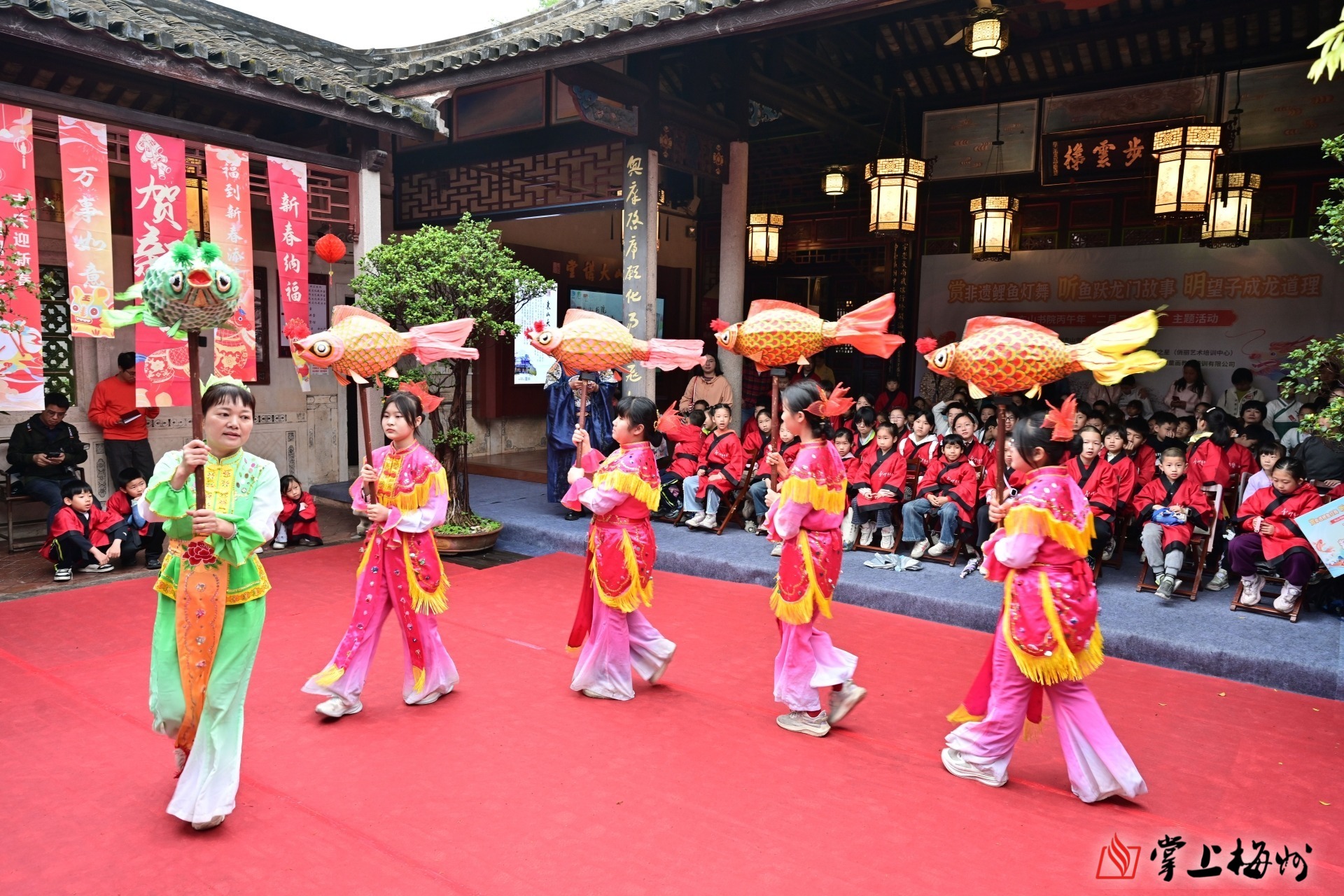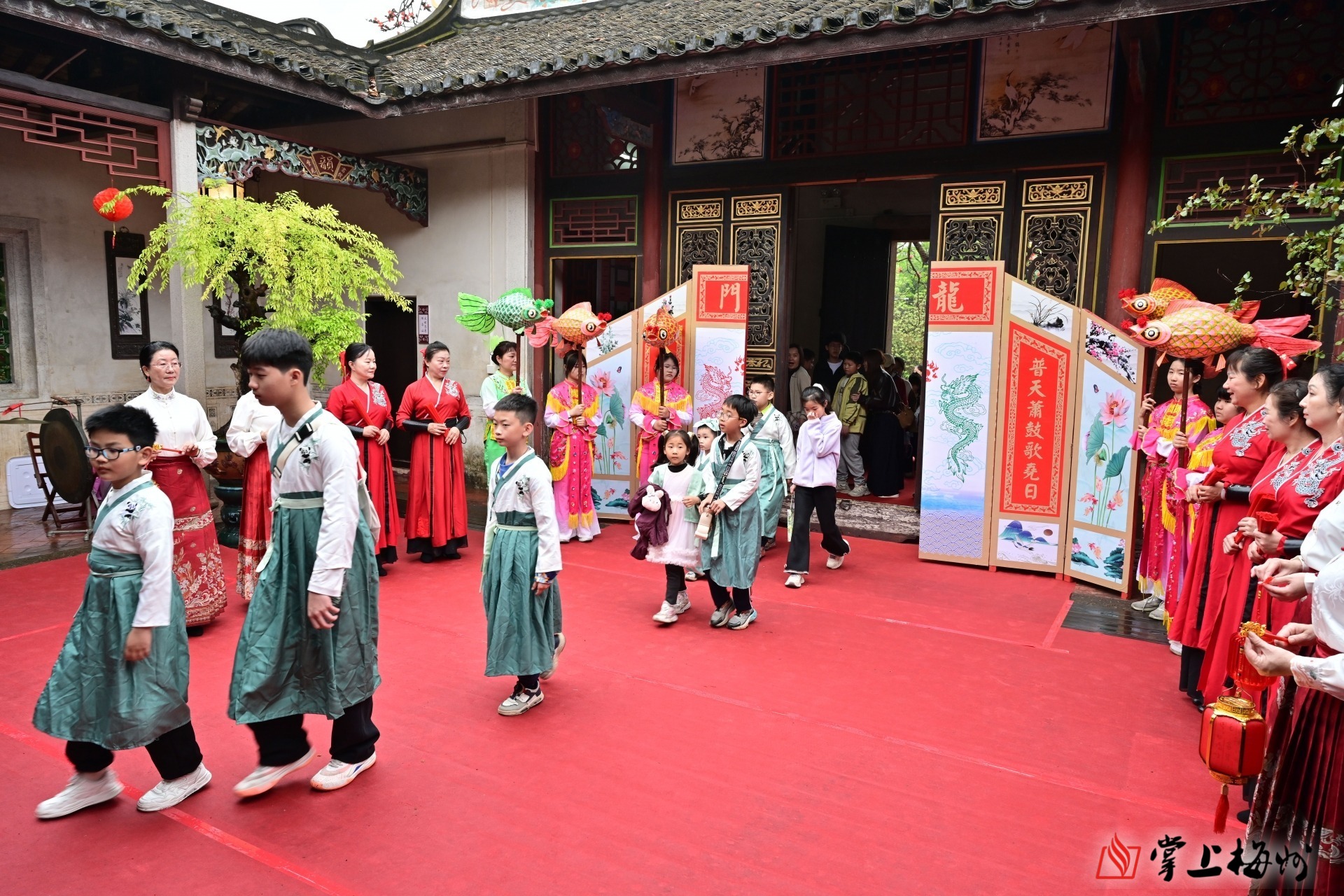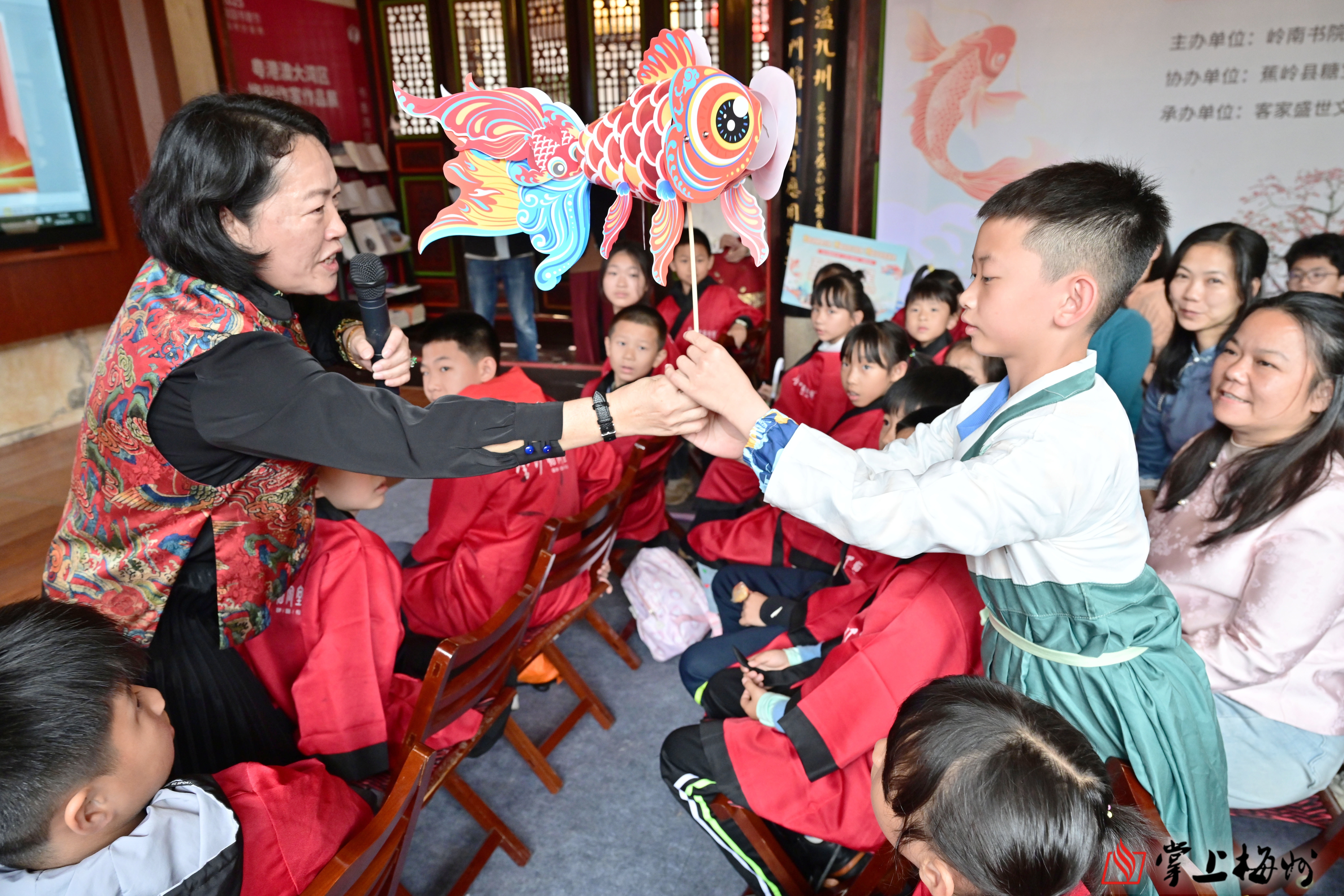 掌上梅州讯 3月21日上午9时许,岭南书院・梅州东山书院内鼓乐声声、欢声阵阵。以“赏非遗鲤鱼灯舞、听鱼跃龙门故事、明望子成龙道理”为主题的“龙腾盛世、鱼跃龙门”丙午年二月二传统文化体验日活动在这里举行。活动以非遗展演、故事分享、亲子互动、文化体验为载体,让百余名青少年与家长沉浸式感受传统民俗魅力,在欢声笑语中传承中华优秀传统文化,厚植崇文重教的客家精神。