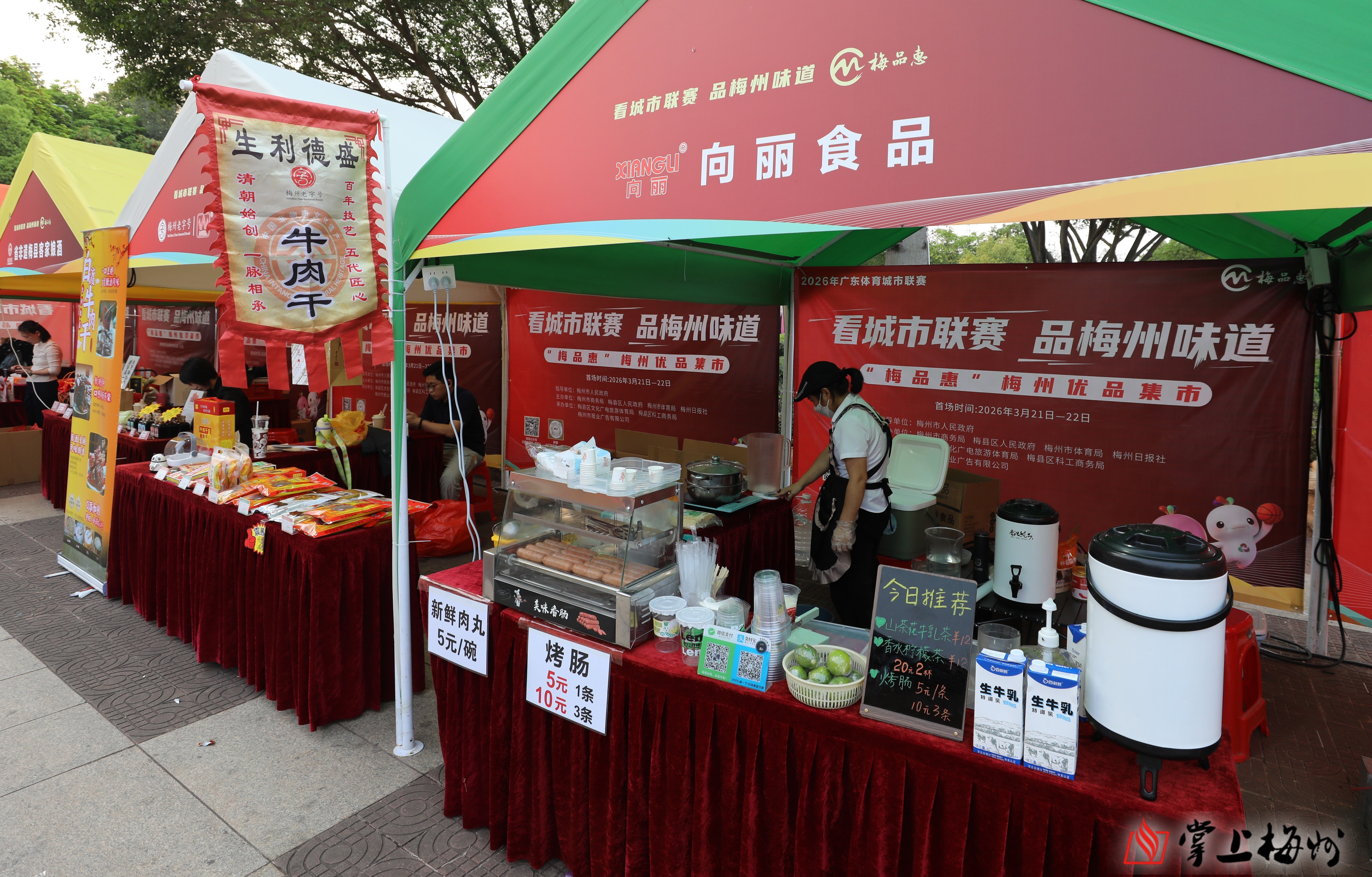 掌上梅州讯 3月22日晚上,2026年广东省城市篮球联赛(粤BA)常规赛首轮在梅县区文体中心进行。借助赛事热潮,3月21日至22日,我市在梅县区人民广场举行“看城市联赛 品梅州味道”——“梅品惠”梅州优品集市系列活动。