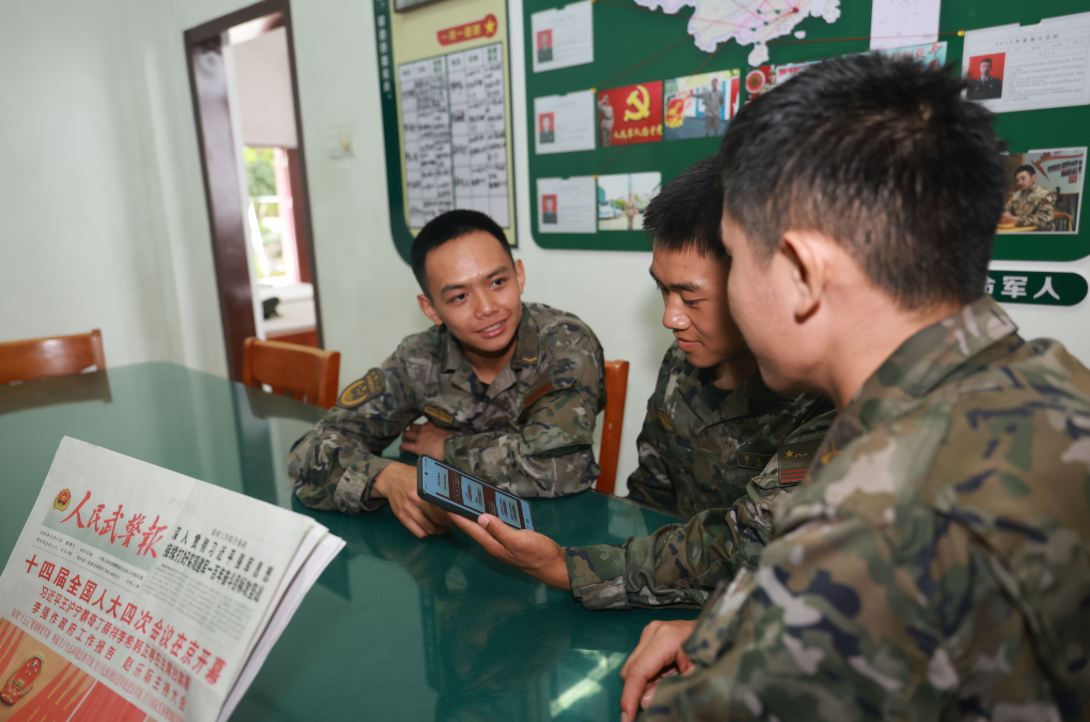 云端+阵地多维学习,让两会精神入脑入心。全国两会胜利召开以来,武警梅州支队党委紧跟会议进程第一时间筹划搭建“云端+线下”双学习阵地,细化学习安排、完善配套资料、抓实宣讲阐释,线上依托强军网、学习强军APP、军职在线等平台,开设“两会精神微课堂”,推送图解海报、要点解读、专家微课,切实打造“指尖上的学习库”。与此同时,该支队还线下盘活营区电子屏、宣传橱窗、文化长廊等阵地,打造“两会精神学习角”。不仅通过张贴会议要点、悬挂宣传标语,让营区处处成为学习课堂,而且创新开展“两会声音早播报”活动,每日早操后、晚点名前,由理论骨干播报两会热点、解读政策要点,把碎片化时间变成学习“黄金时段”,线上线下同步发力、全域覆盖,让学习融入日常、抓在经常,营造“时时能学、处处可学、人人乐学”的浓厚氛围。互动+研讨思想交锋,让理解走深走实。“以前觉得两会离我们很远,现在每天听几分钟,再加上中队平日的宣讲解读,我对两会精神有了更真切的理解,也更加清楚国家发展蓝图与军队建设目标。我现在学有方向、干有动力,练兵备战的劲头也更加足了!”刚下连的一名新兵说。