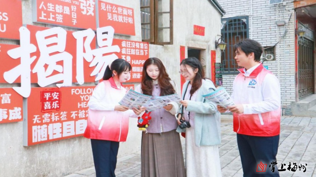 汕梅高速青年职工在揭阳古城为游客提供旅游指引并宣传交通安全。