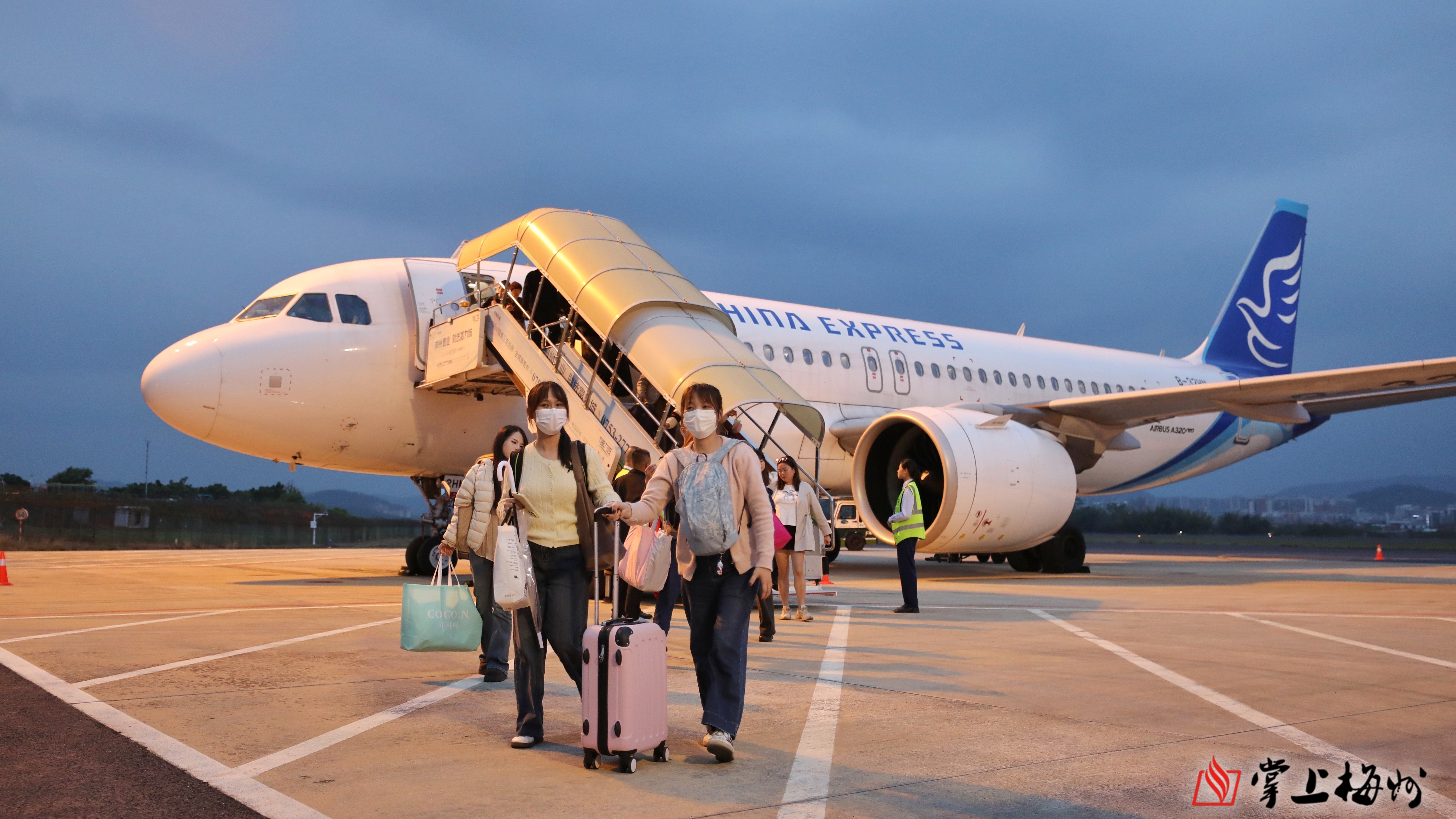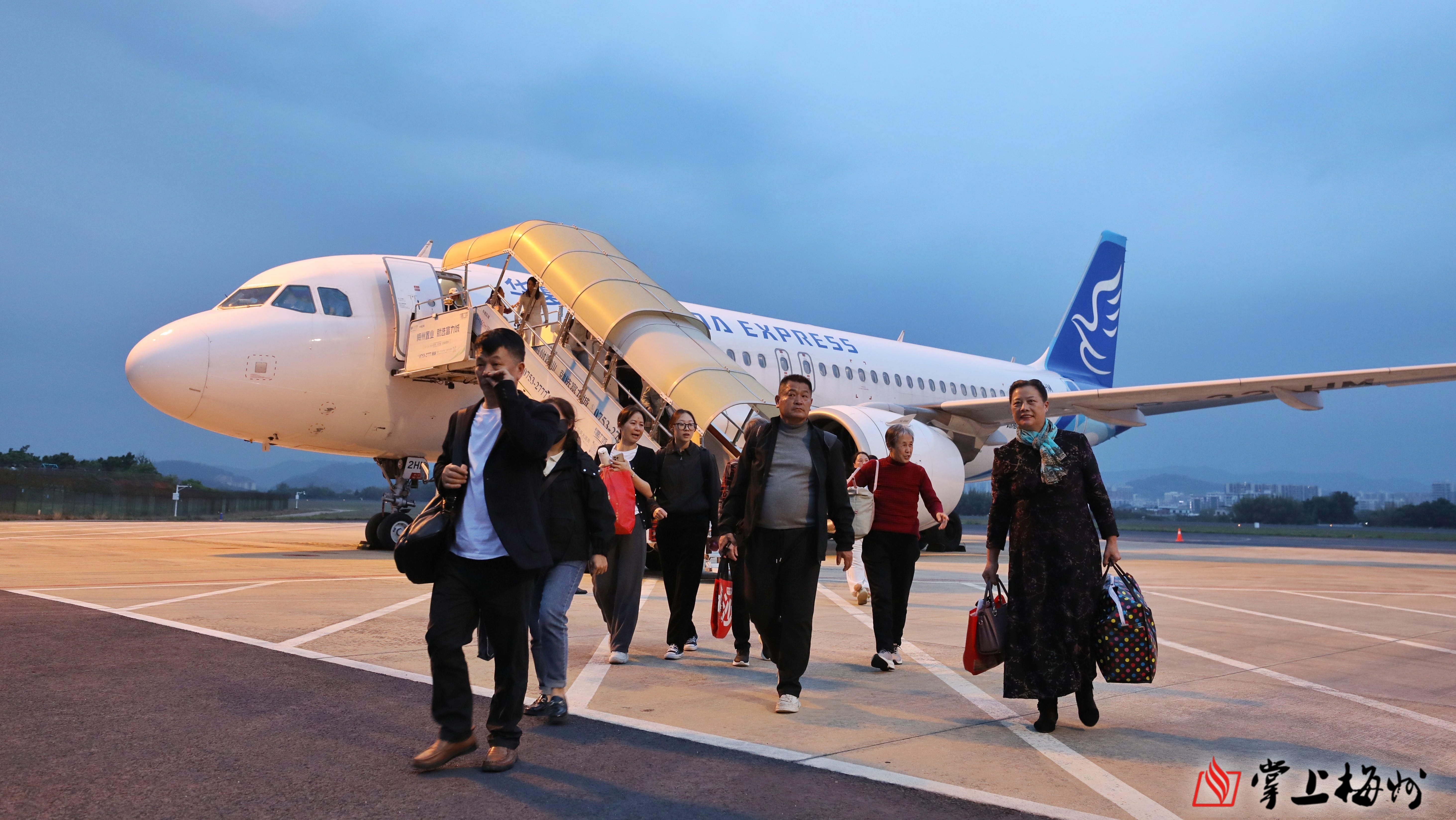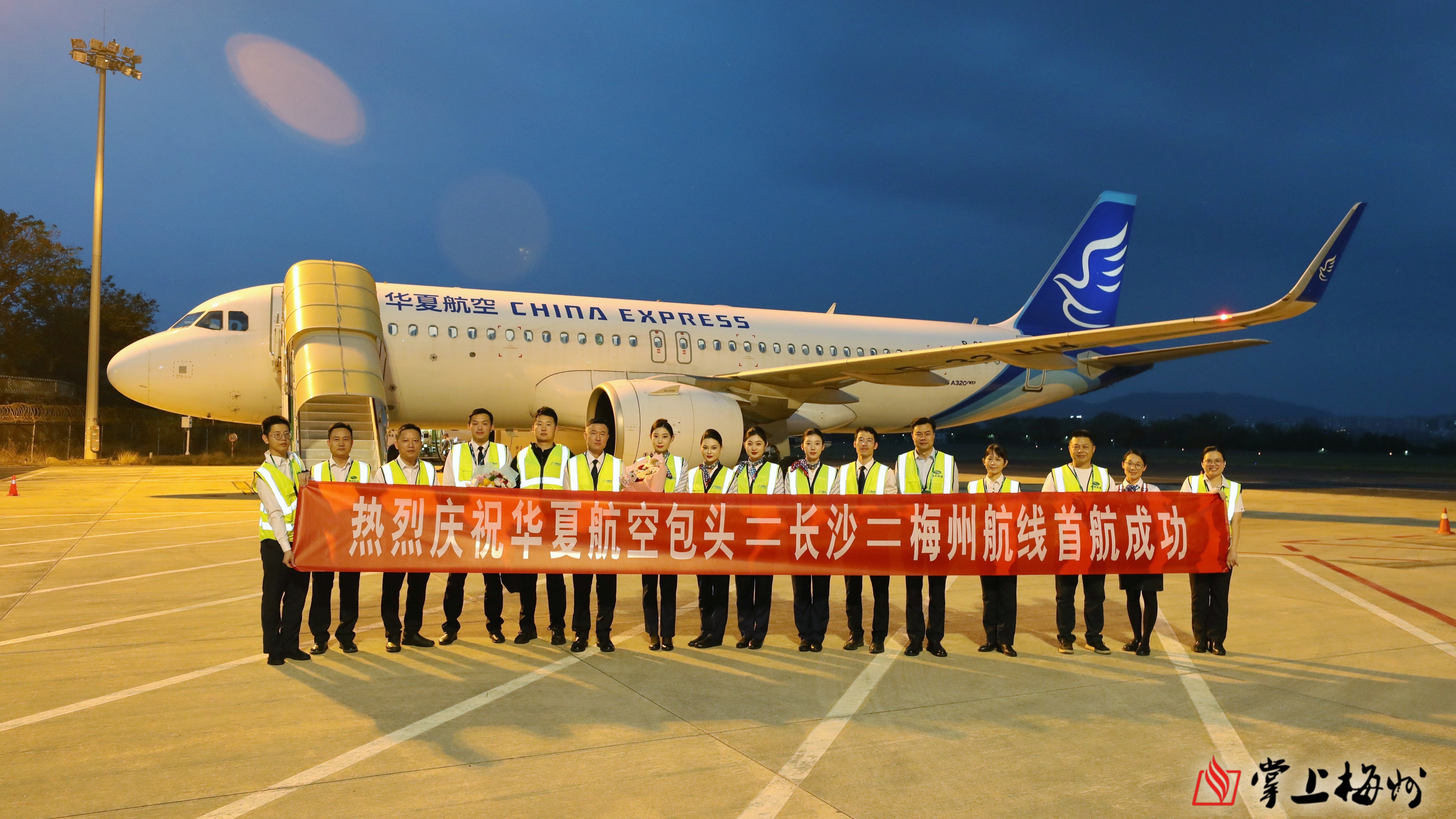 掌上梅州讯 3月29日18时18分,随着华夏航空G54767航班平稳降落在梅州机场,标志着包头=长沙=梅州开航。