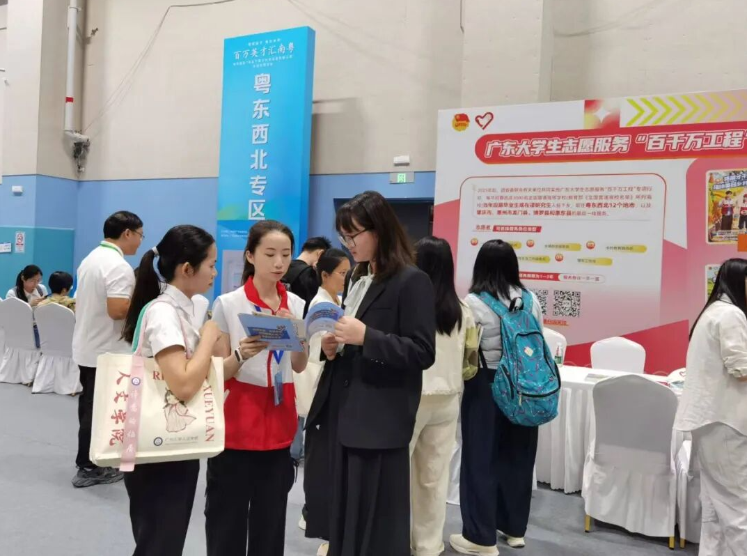 在青年服务“百县千镇万村高质量发展工程”专题招聘活动现场,来自市大学生成长促进会、就读于华南农业大学的6名梅州籍学子化身“引才大使”,结合自身成长故事与返乡发展经历,向广大应聘青年倾情推介梅州,介绍“免费梅州”政策。在梅州服务的西部计划广东地方项目志愿者代表向应届毕业生宣讲2026年西部计划招募政策,并以自身扎根基层的实践经历,鼓励广大青年投身“百千万工程”火热实践,在服务苏区振兴中助力“十五五”良好开局。
