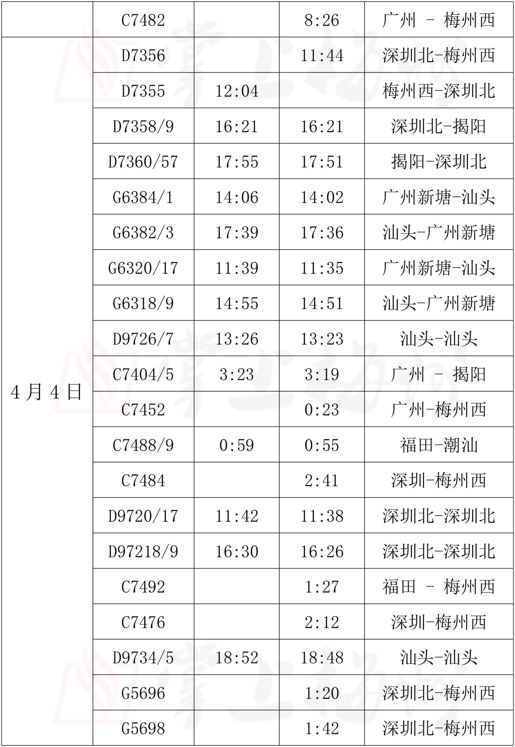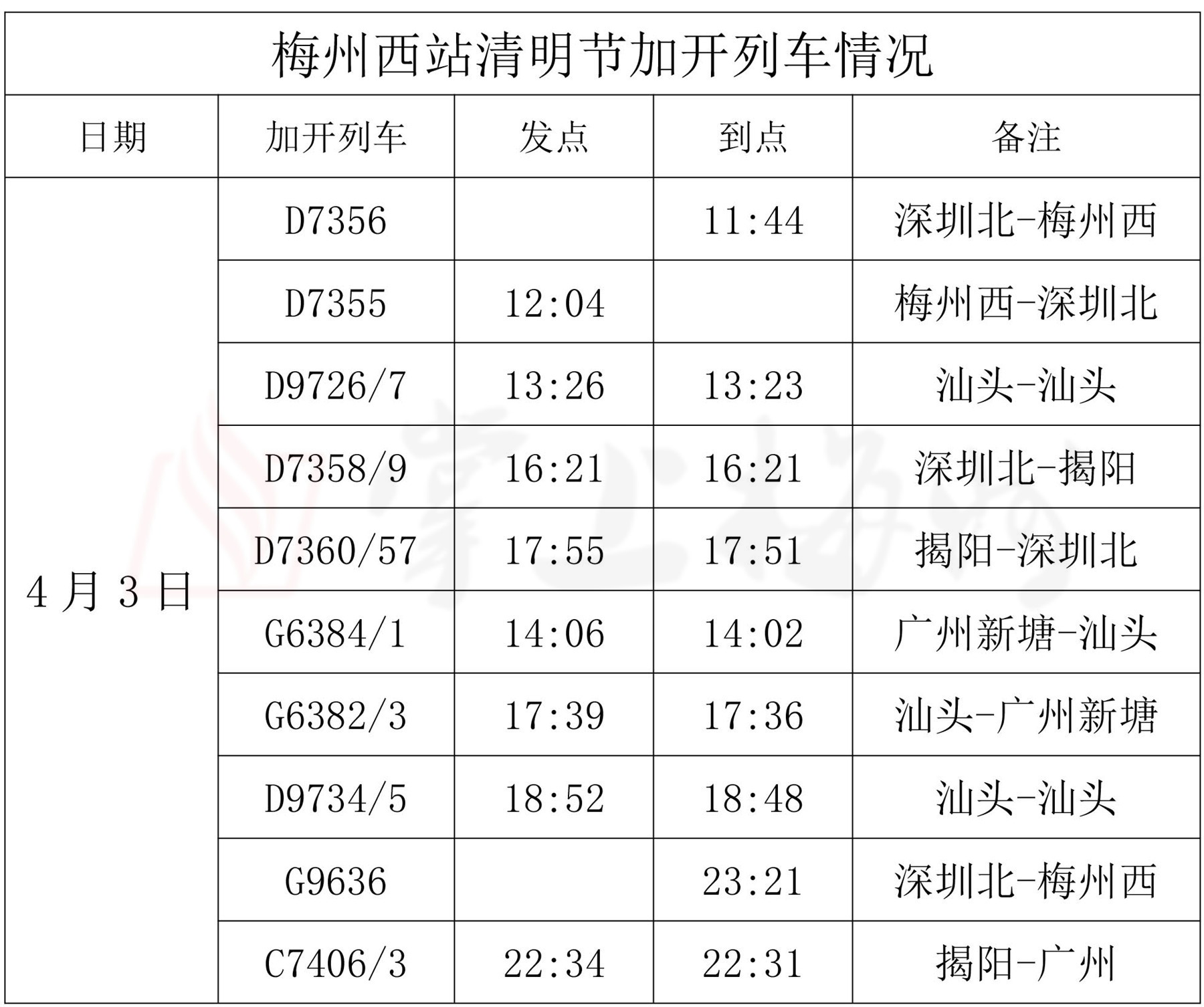 掌上梅州讯 清明假期将至,祭扫、踏青、探亲客流迎来叠加高峰。记者从梅州西站获悉,为全力满足广大旅客出行需求,保障假期运输安全有序,梅州西站科学优化运力调配,在4月3日至7日,累计加开列车62趟,其中专门加开9趟夜间高铁,全力打通旅客出行“最后一公里”,让返乡祭扫、外出游玩的旅客出行更便捷、更顺畅。