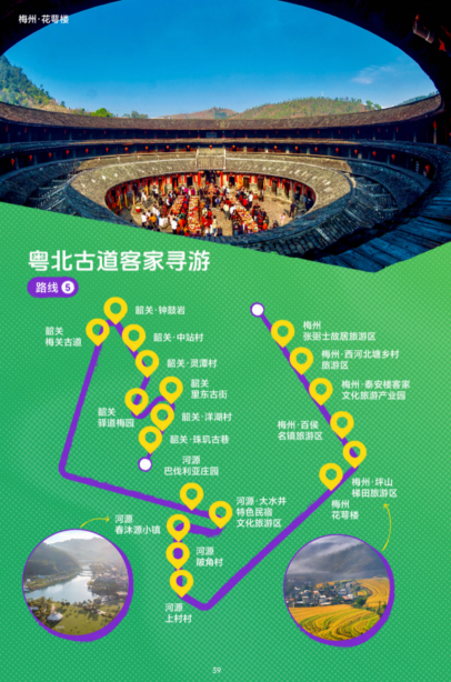 其中,“粤北古道客家寻游”线路为:韶关(珠玑古巷、洋湖村、里东古街、驿道梅园、灵潭村、中站村、钟鼓岩、梅关古道)—河源(巴伐利亚庄园、大水井特色民宿文化旅游区、春沐源小镇、陂角村、上村村)—梅州(花萼楼、坪山梯田旅游区、百侯名镇旅游区、泰安楼客家文化旅游产业园、西河北塘乡村旅游区、张弼士故居旅游区)。
