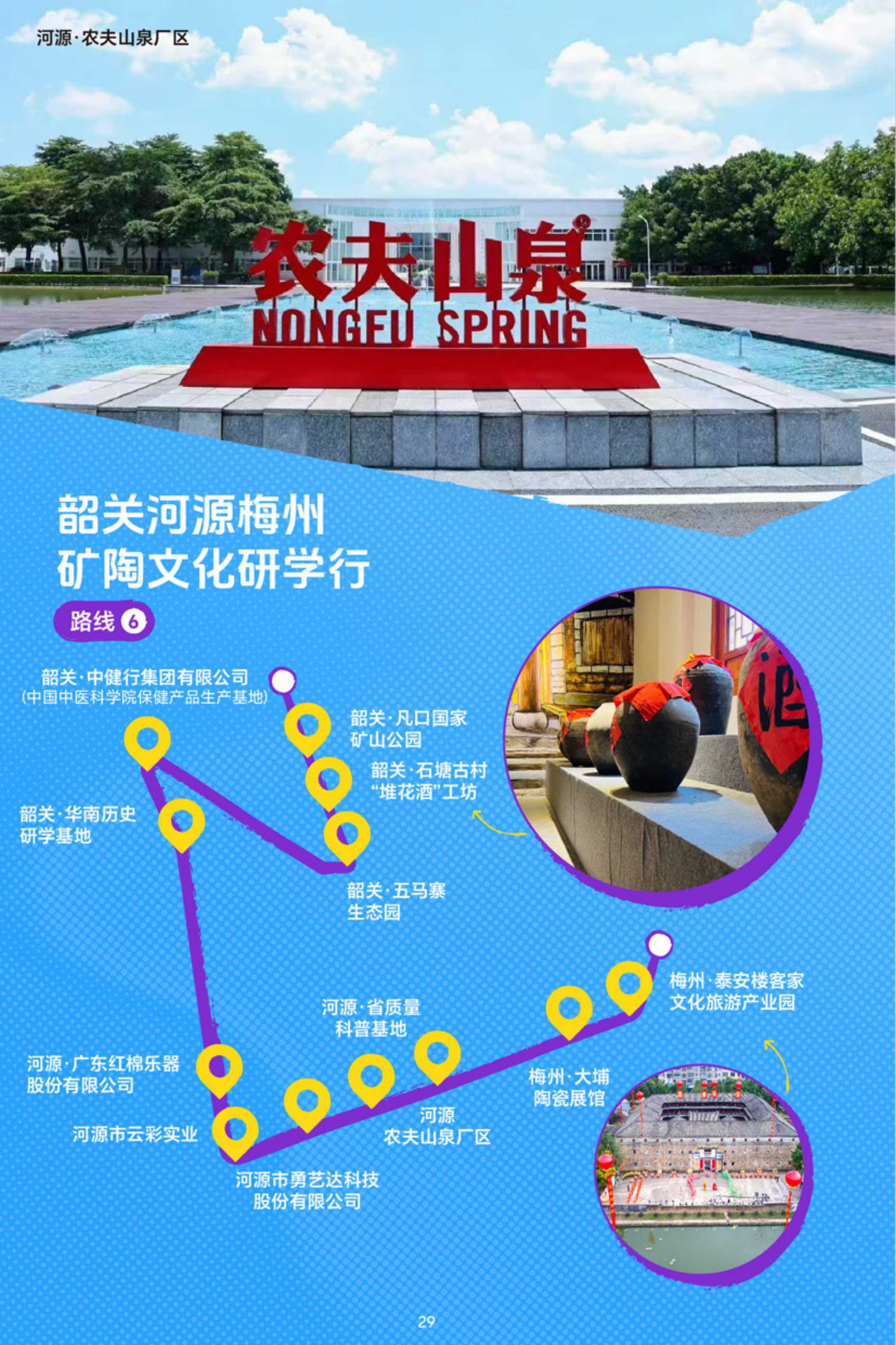 其中,“韶关河源梅州矿陶文化研学行”线路为:韶关[凡口国家矿山公园、石塘古村“堆花酒”工坊、五马寨生态园、中健行集团有限公司(中国中医科学院保健产品生产基地)、华南历史研学基地]—河源(广东红棉乐器股份有限公司、河源市云彩实业、河源市勇艺达科技股份有限公司、省质量科普基地、农夫山泉厂区)—梅州(大埔陶瓷展馆、泰安楼客家文化旅游产业园)。