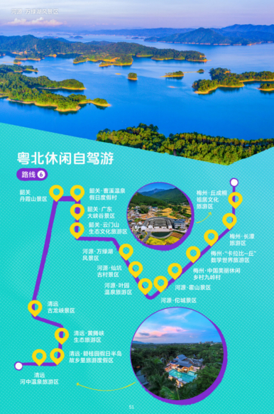其中,“粤北休闲自驾游”线路为:清远(河中温泉旅游区、碧桂园假日半岛故乡里旅游度假区、黄腾峡生态旅游区、古龙峡景区)—韶关(丹霞山景区、曹溪温泉假日度假村、广东大峡谷景区、云门山生态文化旅游区)—河源(万绿湖风景区、仙坑古村景区、叶园温泉旅游区、佗城景区、霍山景区)—梅州(中国美丽休闲乡村九岭村、“卡拉比—丘”数学世界旅游区、长潭旅游区、丘成桐祖居文化旅游区)。