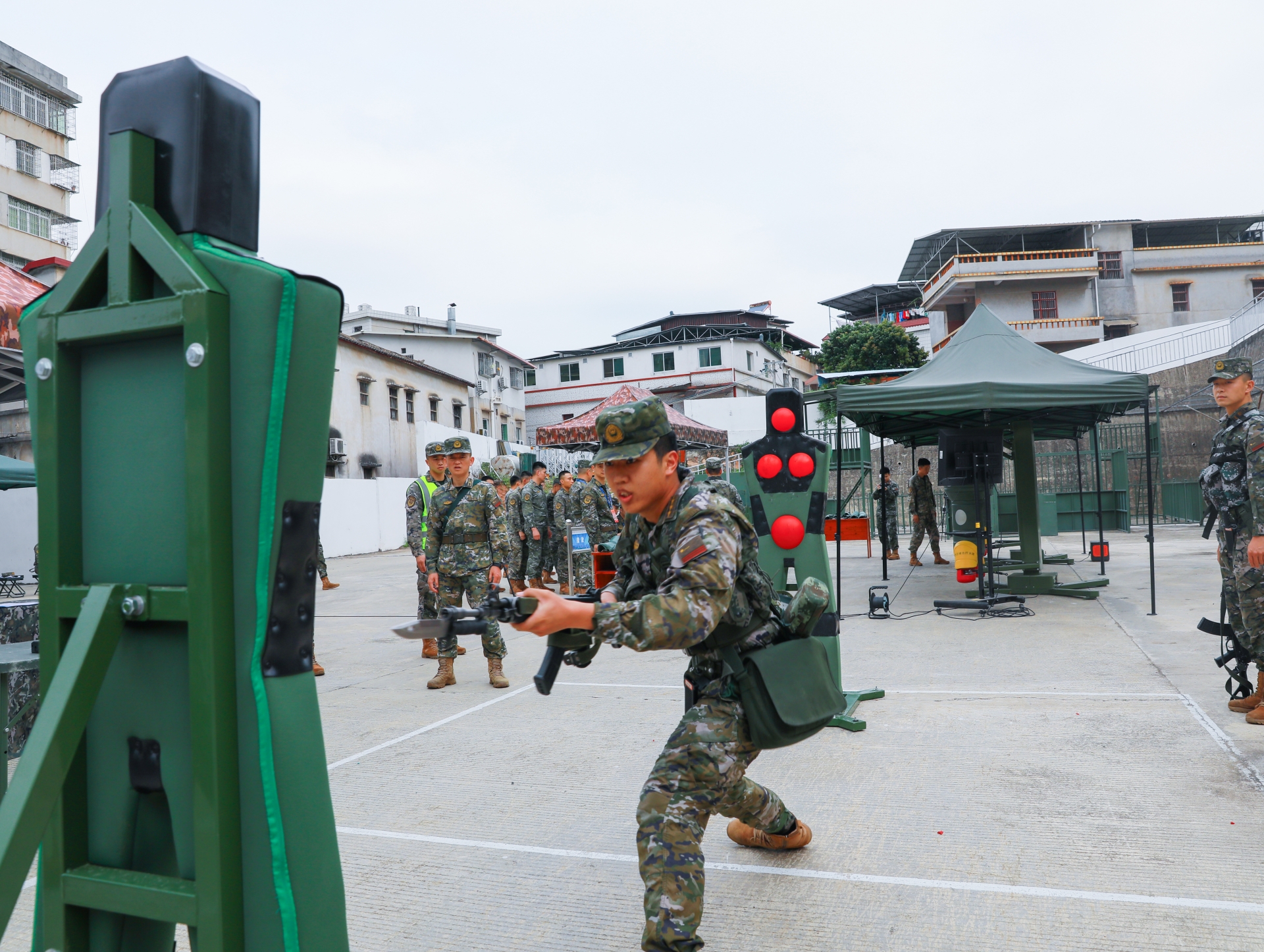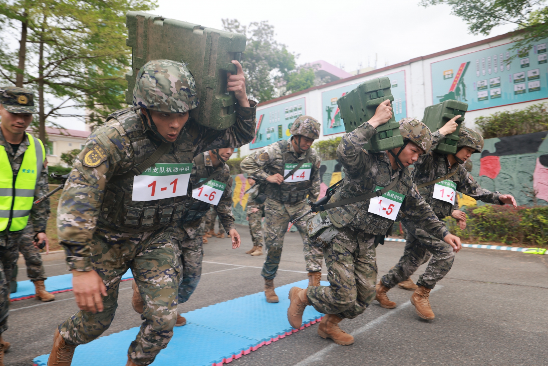 团体竞赛作为此次比武的重头戏,以作战小组清剿残敌为实战背景,设置机动接敌、火力打击、追击搜索、清剿营救4个作战阶段,全程3公里的综合战术课目,重点检验作战小队的协同配合能力与快速打击能力。“全体注意,按预案展开处置!”指挥员一声令下,作战小队迅速行动、分工明确、配合默契,在体能极限与复杂场景的双重考验下,队员们相互鼓励、彼此支撑,咬牙突破自我,克服一个又一个难关,用团结与奋斗圆满完成各项作战任务,彰显了“团结就是力量”的强大凝聚力。