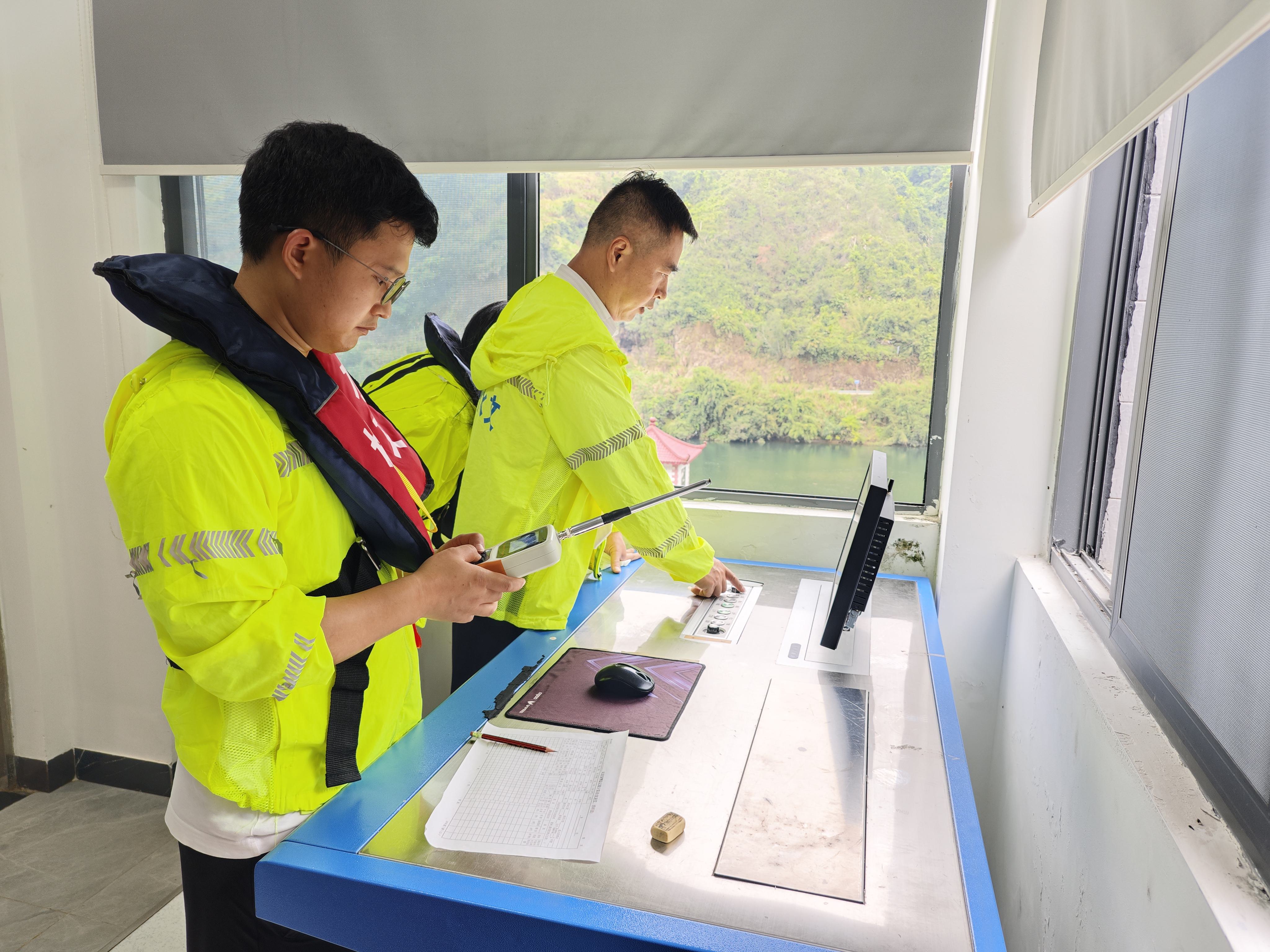 应急监测2组在汀江大桥断面,熟练操作雷达测速枪、飞行浮标及电子小浮标,高效完成断面流速、流量的应急抢测,确保数据实时回传。