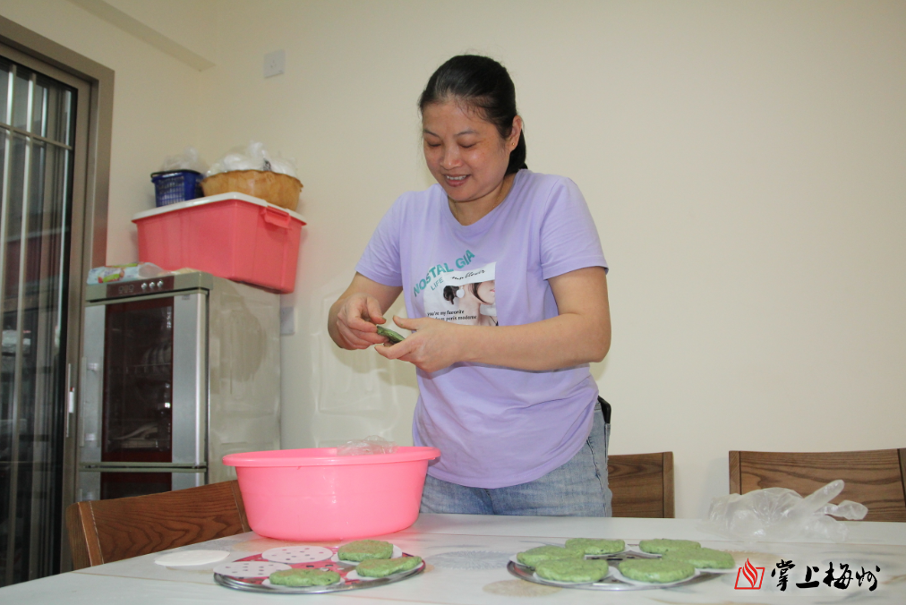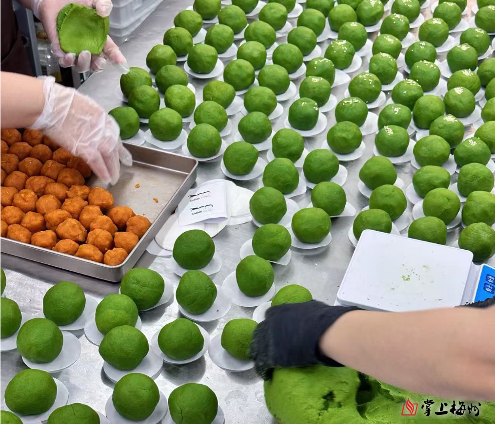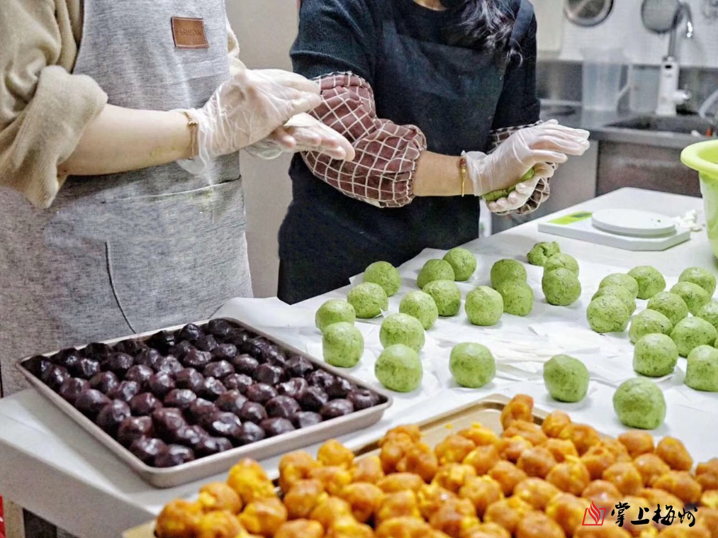 梅城甜品店仨宝员工在制作青团(受访者供图)