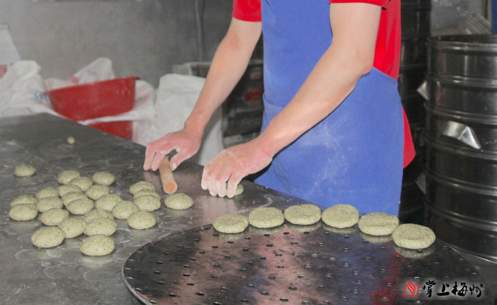 除了家家户户自制,市场上的清明粄也早早进入热销期。记者走进梅县区油坊垅巷的松口包点店,只见店内一派忙碌景象,店主李先生正将一个个小面团压成饼状,整齐摆放在蒸屉上。他告诉记者,店里的清明粄全程坚持纯手工制作,从摘叶、洗净、剁碎,到一遍遍揉面、塑形,每一步都遵循传统制法。传统做法虽然步骤多、耗时长,但能留住清明粄最地道的青草香与软糯口感。