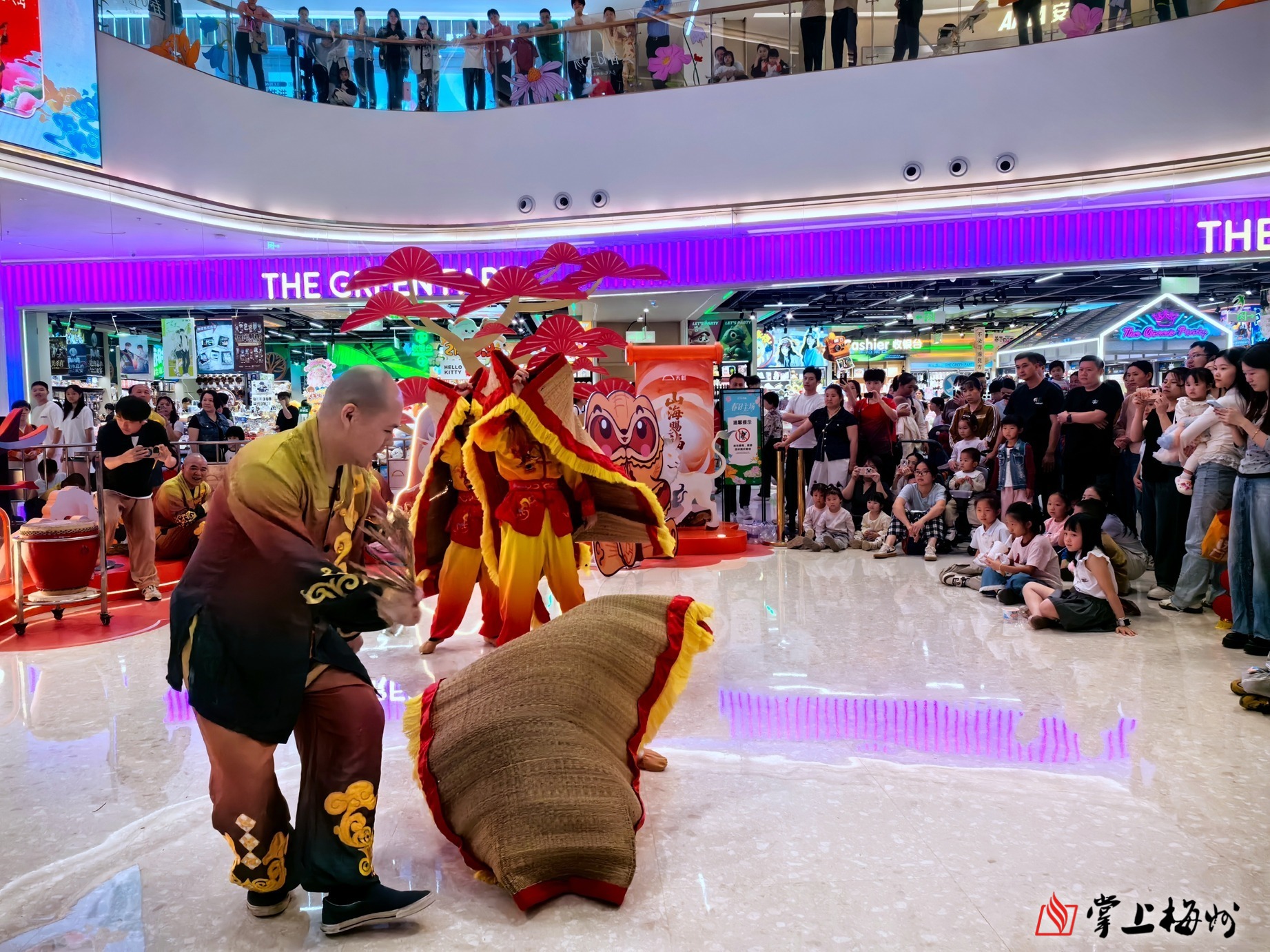 4月5日下午3点,梅州天虹购物中心的中庭早已被围得水泄不通,人潮涌动间,欢呼声、音乐声此起彼伏,一场独具特色的席狮舞表演正在精彩上演。只见表演者们身着草席制成的“狮身”,惟妙惟肖地模仿着狮子的一举一动。从“出狮”时的灵动探头,到“引狮”环节的俏皮互动,再到“舞狮”过程中的跳跃翻滚,每一个动作都精准到位,引得观众们目不转睛,看得津津有味,掌声和叫好声接连不断。