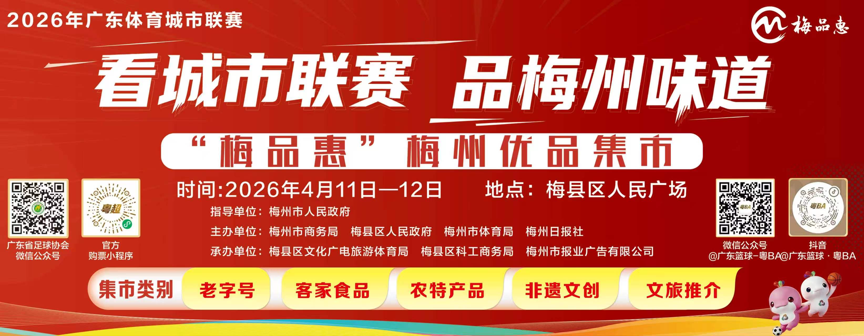 粤BA第三轮来啦!梅州队将坐镇主场梅县文体中心迎战河源队。为让赛事更贴近生活、让城市更有烟火气,由梅州市人民政府指导,梅州市商务局、梅县区人民政府、梅州市体育局、梅州日报社联合主办的“看城市联赛 品梅州味道”——“梅品惠”梅州优品集市第二场活动,将于4月11日—12日在梅县区人民广场热闹开启!