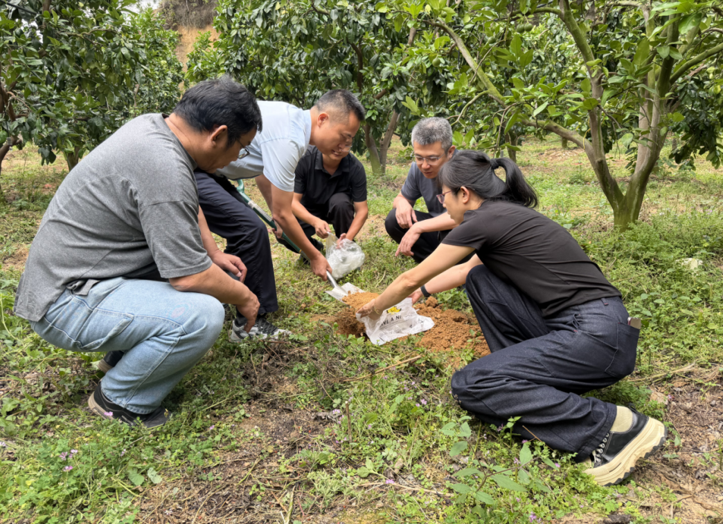 4月21日下午,在梅州市农林科学院果树研究所负责人陪同下,专家团队首先前往大埔县,先后深入大东镇洪源果场、高陂镇杉富绿色生态农业发展有限公司种植基地,针对梅州柚品质提升开展现场技术指导。专家们实地察看柚树长势、挂果情况及果园管理现状,围绕土壤健康、科学肥水、树体调控等关键环节,与种植户深入交流并进行实操示范。为实现精准施肥与营养管理,团队现场采集果园土壤样本,带回实验室系统分析肥力状况,为后续制定个性化营养调控方案、提升柚子品质与产量提供科学数据支撑。