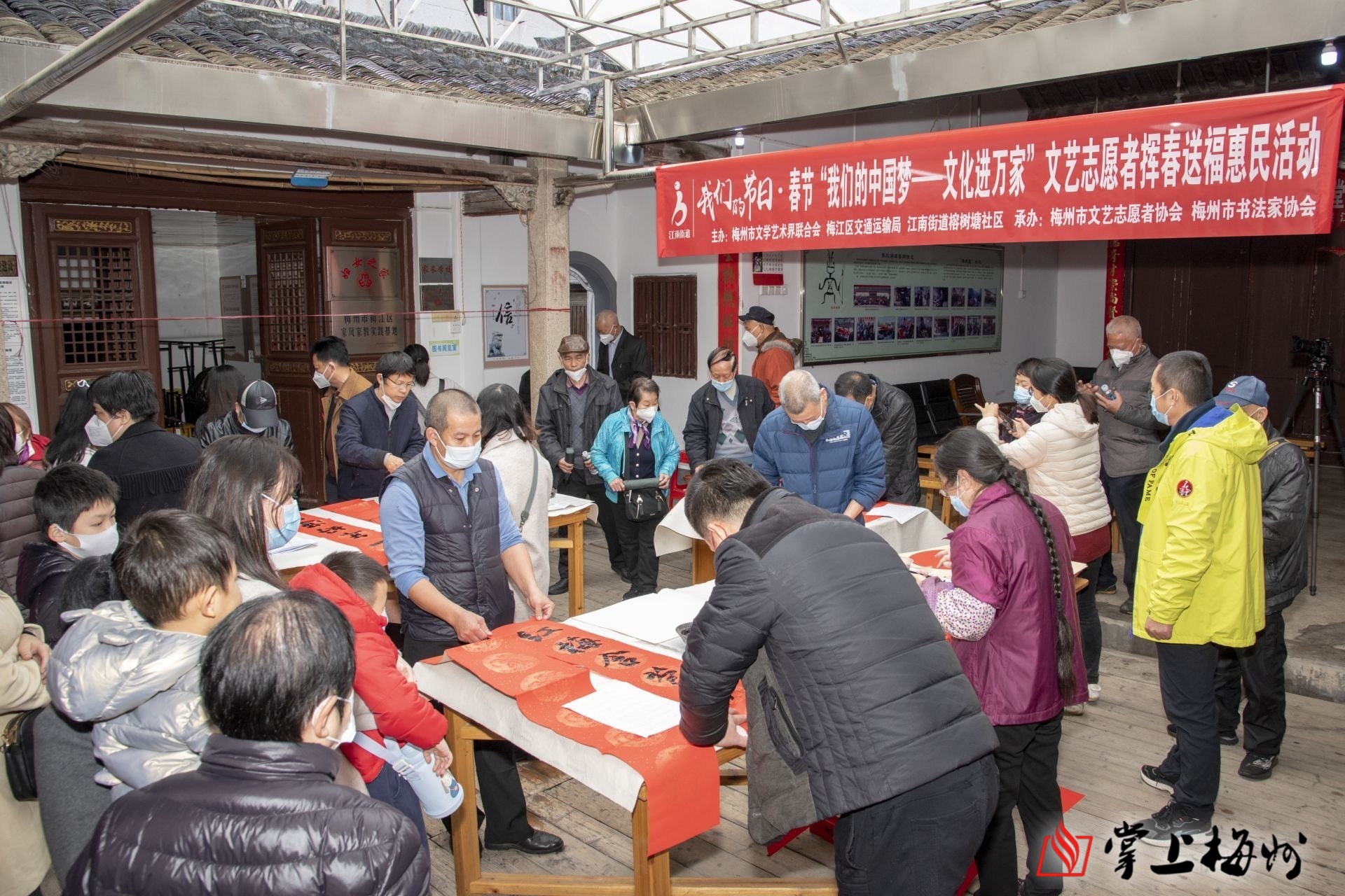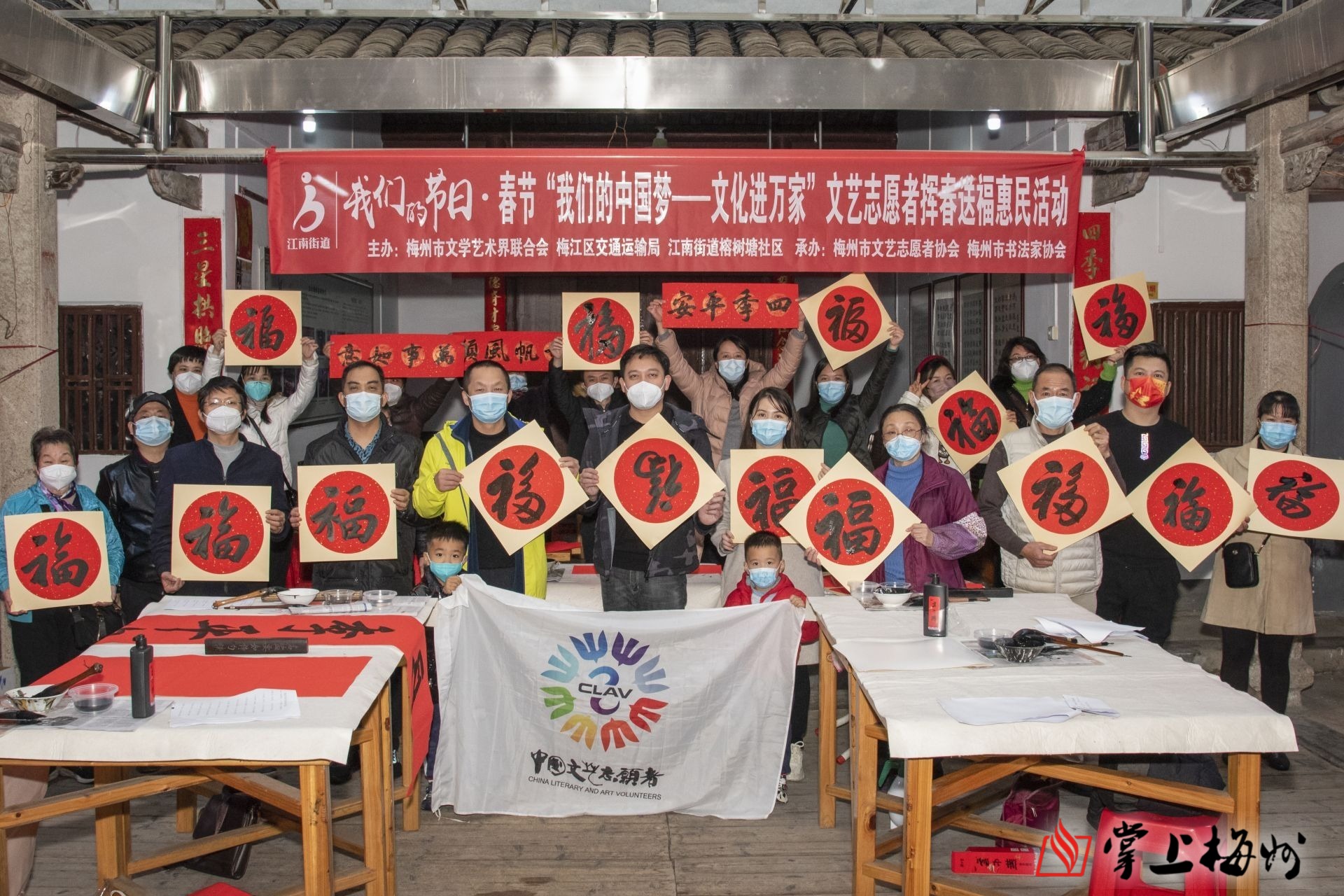 据悉,此次活动由梅州市文联、梅江区交通运输局、江南街道榕树塘社区主办,市文艺志愿者协会、市书法家协会承办。活动为社区居民送出300多副春联、100多个“福”字,部分春联由社区志愿者上门派送。此次文艺志愿服务活动是市文联“我们的中国梦·文化进万家”系列活动之一,采取书法家们现场书写春联和福字,再分送的方式。近期,榕树塘社区志愿者将把文艺志愿者书写的春联和福字,陆续送到社区居民、低保户家中,表达文艺工作者的新春祝福,将新春的祝福和浓浓的年味送到千家万户,让群众度过一个欢乐祥和健康的新春佳节。