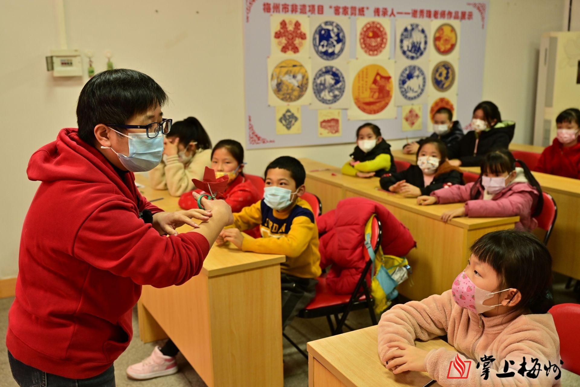 “运用手腕的力量,沿着线进行裁剪……”活动现场,一把剪刀,一张红纸,从简单折叠到剪法,谢秀珠一步步进行讲授,孩子们聚精会神地听讲,模仿老师的手法,每个环节都一丝不苟。经过折、画、剪等步骤,一幅幅栩栩如生的兔元素剪纸作品跃然眼前,红纸在指尖焕发出了别样的风采。“在老师的指导下,我动手剪出了一个很可爱的兔子,在这个过程中,真切感受到了客家传统文化的魅力。”参加活动的张芷晞一边剪纸一边说道。
