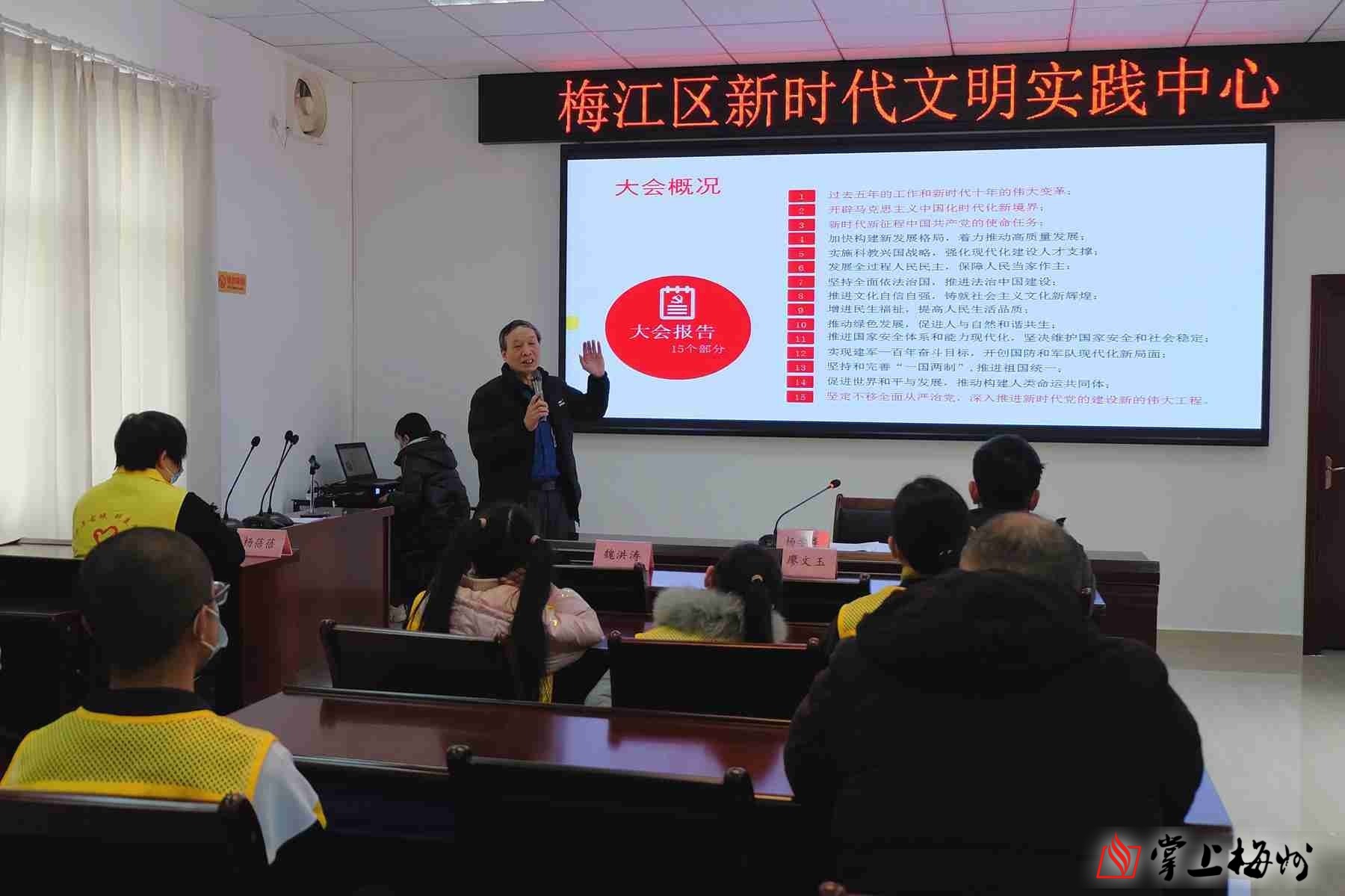 学习贯彻党的二十大精神宣讲报告会上,梅江区委宣讲团成员、四级调研员杨学粦进行主讲。