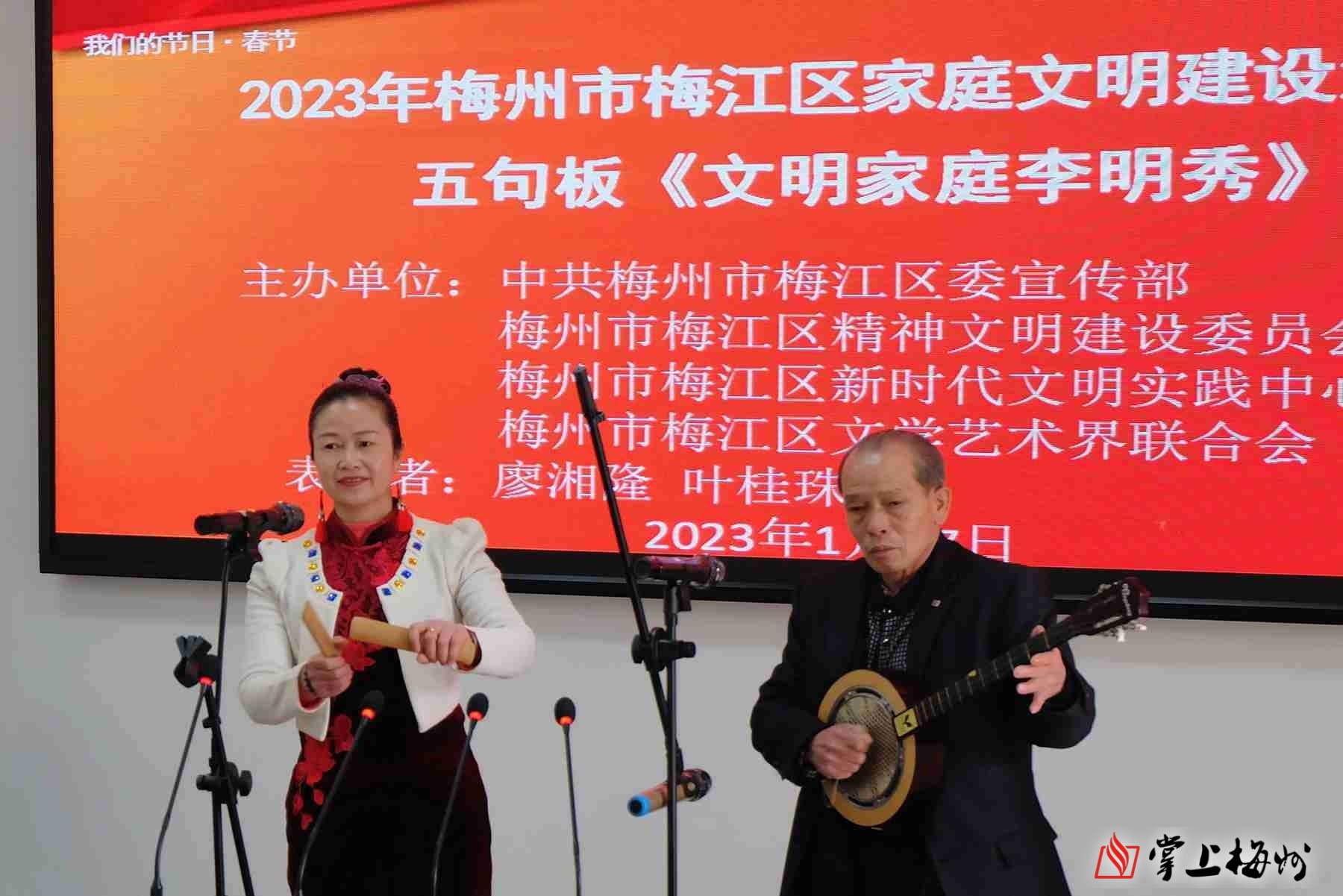 为2022年梅江区获评“广东好人”“梅州好人”的先进典型模范授荣,“梅州好人”代表杨蓓蓓蓓谈心得体会,文艺志愿者以五句板等形式歌颂道德模范、文明家庭……记者在17日的活动现场看到,市民们认真聆听宣讲报告、观看文艺演出,进一步增强了感党恩、听党话、跟党走的信心和决心,还学习体验了独具客家特色的剪纸技艺,领略中华传统文化的魅力,现场热闹非凡。“接下来,梅江区多部门将在元宵节联合举办一场促消费文明集市活动,宣传推广非遗项目;全区各新时代文明实践所(站)将在春节期间开展多场文明实践志愿服务活动,欢迎市民朋友积极参与,一起欢乐过大年。”活动主办方负责人说。
