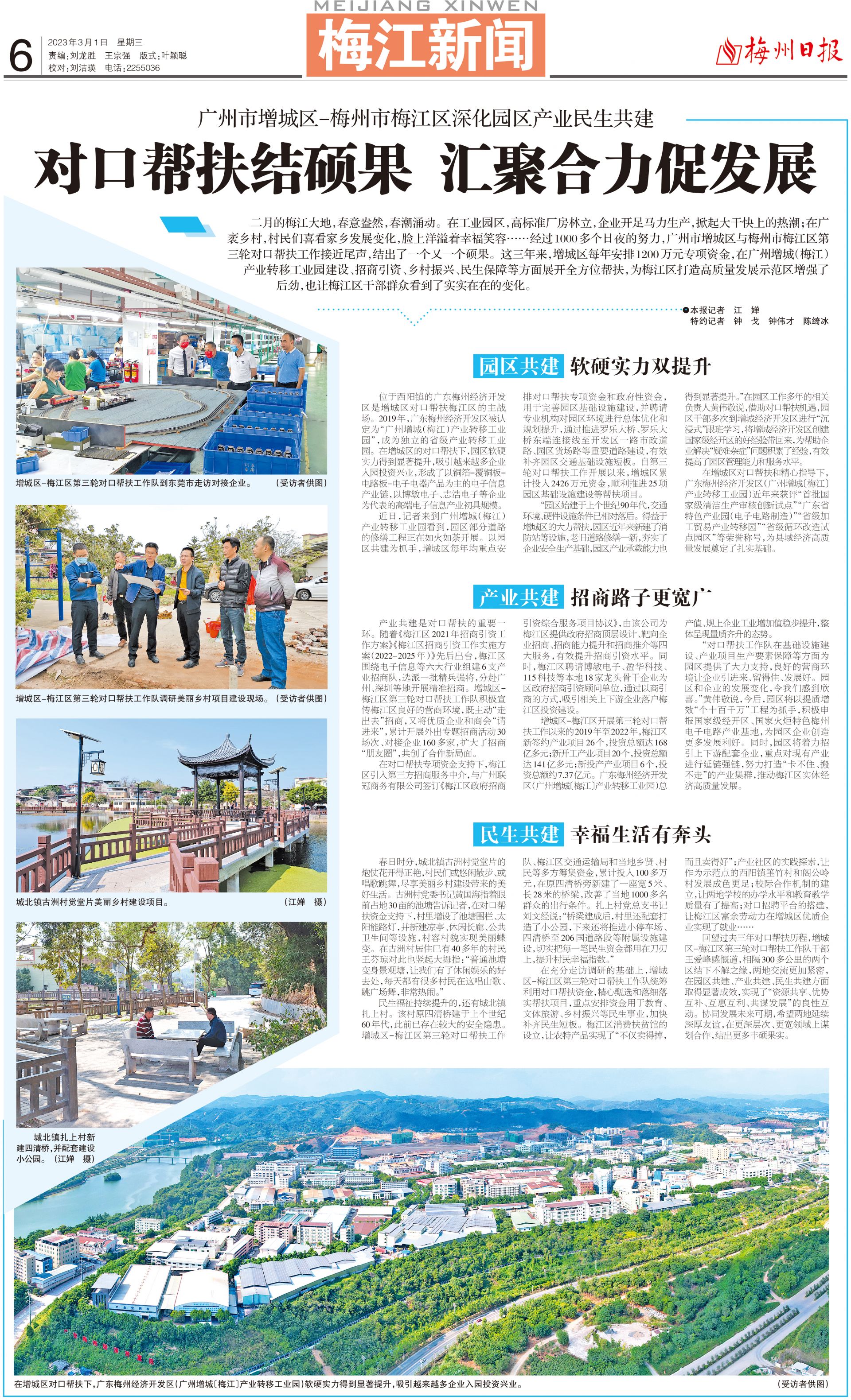 二月的梅江大地,春意盎然,春潮涌动。在工业园区,高标准厂房林立,企业开足马力生产,掀起大干快上的热潮;在广袤乡村,村民们喜看家乡发展变化,脸上洋溢着幸福笑容……经过1000多个日夜的努力,广州市增城区与梅州市梅江区第三轮对口帮扶工作接近尾声,结出了一个又一个硕果。这三年来,增城区每年安排1200万元专项资金,在广州增城(梅江)产业转移工业园建设、招商引资、乡村振兴、民生保障等方面展开全方位帮扶,为梅江区打造高质量发展示范区增强了后劲,也让梅江区干部群众看到了实实在在的变化。