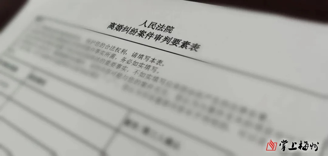 据了解,该案为梅江法院受理的原告蓝某与被告徐某离婚纠纷一案。开庭前,主办法官通过阅卷发现双方当事人争议矛盾不大,案件事实较为清楚,征得双方同事人同意后,遂向双方发放了提前制作的《离婚纠纷案件审判要素表》,指导当事人依据事实填写表格内容,提前快速了解子女、财产情况。