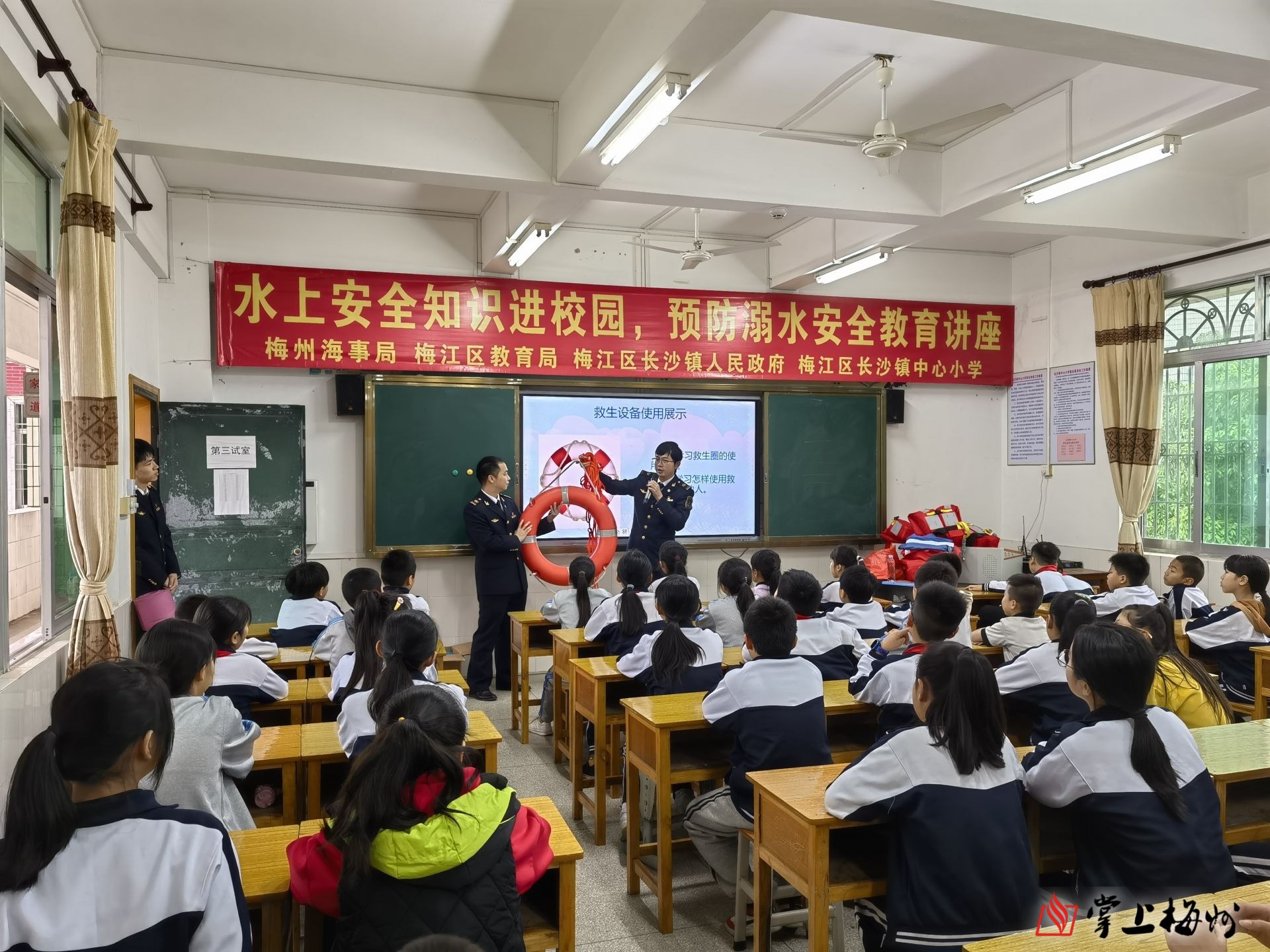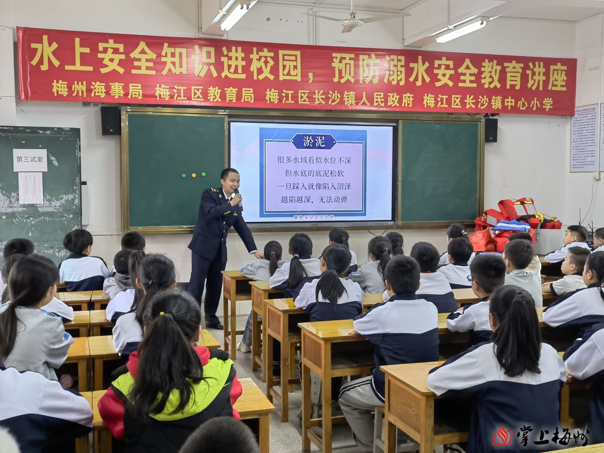 掌上梅州讯 28日,梅州海事局联合梅江区教育局、梅江区长沙镇人民政府、梅江区长沙镇中心小学在长沙镇中心小学开展“水上安全知识进校园”活动,为广大师生送去一堂生动有趣的水上交通安全课。