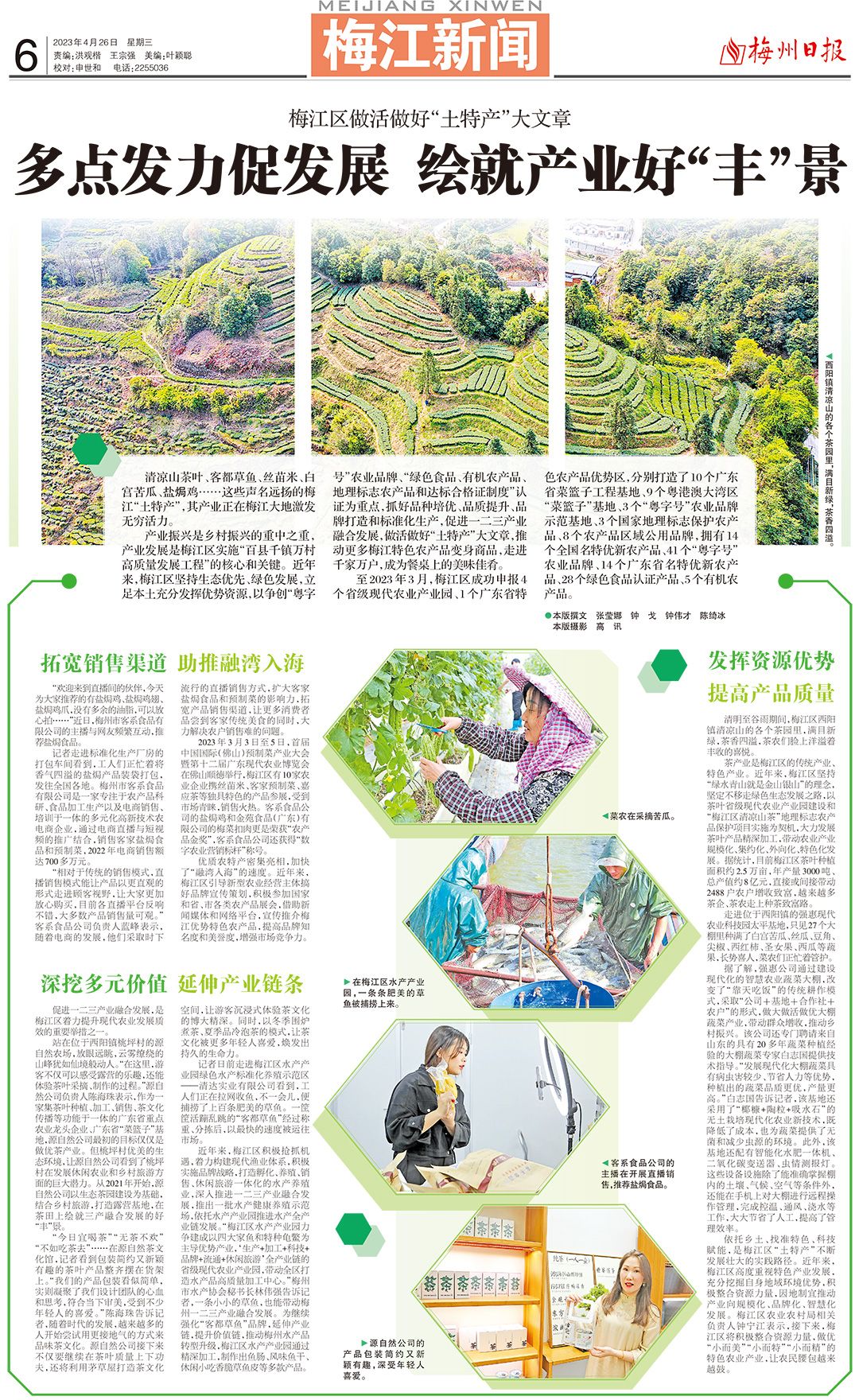 产业振兴是乡村振兴的重中之重,产业发展是梅江区实施“百县千镇万村高质量发展工程”的核心和关键。近年来,梅江区坚持生态优先、绿色发展,立足本土充分发挥优势资源,以争创“粤字号”农业品牌、“绿色食品、有机农产品、地理标志农产品和达标合格证制度”认证为重点,抓好品种培优、品质提升、品牌打造和标准化生产,促进一二三产业融合发展,做活做好“土特产”大文章,推动更多梅江特色农产品变身商品,走进千家万户,成为餐桌上的美味佳肴。