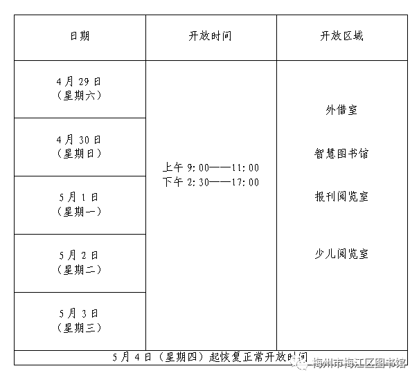 别跑空!劳动节假期,梅江区图书馆开放时间看这→ 2023-04-27 17:45 梅州市梅江区图书馆 0 尊敬的读者朋友: 根据《国务院办公厅关于2023年部分节假日安排的通知》,结合梅江区图书馆实际,2023年劳动节假期开放时间安排如下: 梅州市梅江区图书馆 2023年4月27日 编辑:刘滨 廖志颖(实习) 审核:严海苑