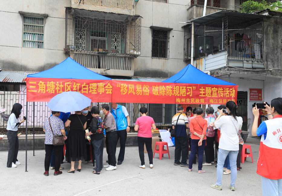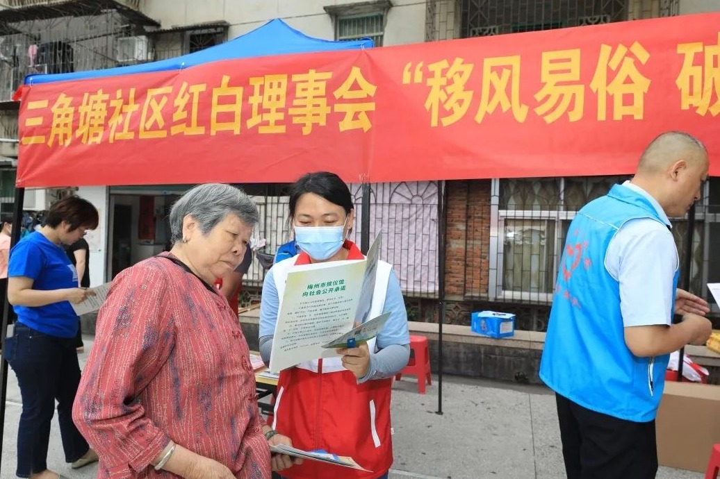 近年来,梅江区积极开展移风易俗活动,各村(社区)先后成立红白理事会,引导群众破除陈规陋习,倡导喜事新办、丧事简办、厚养薄葬、勤俭节约的文明新风尚。