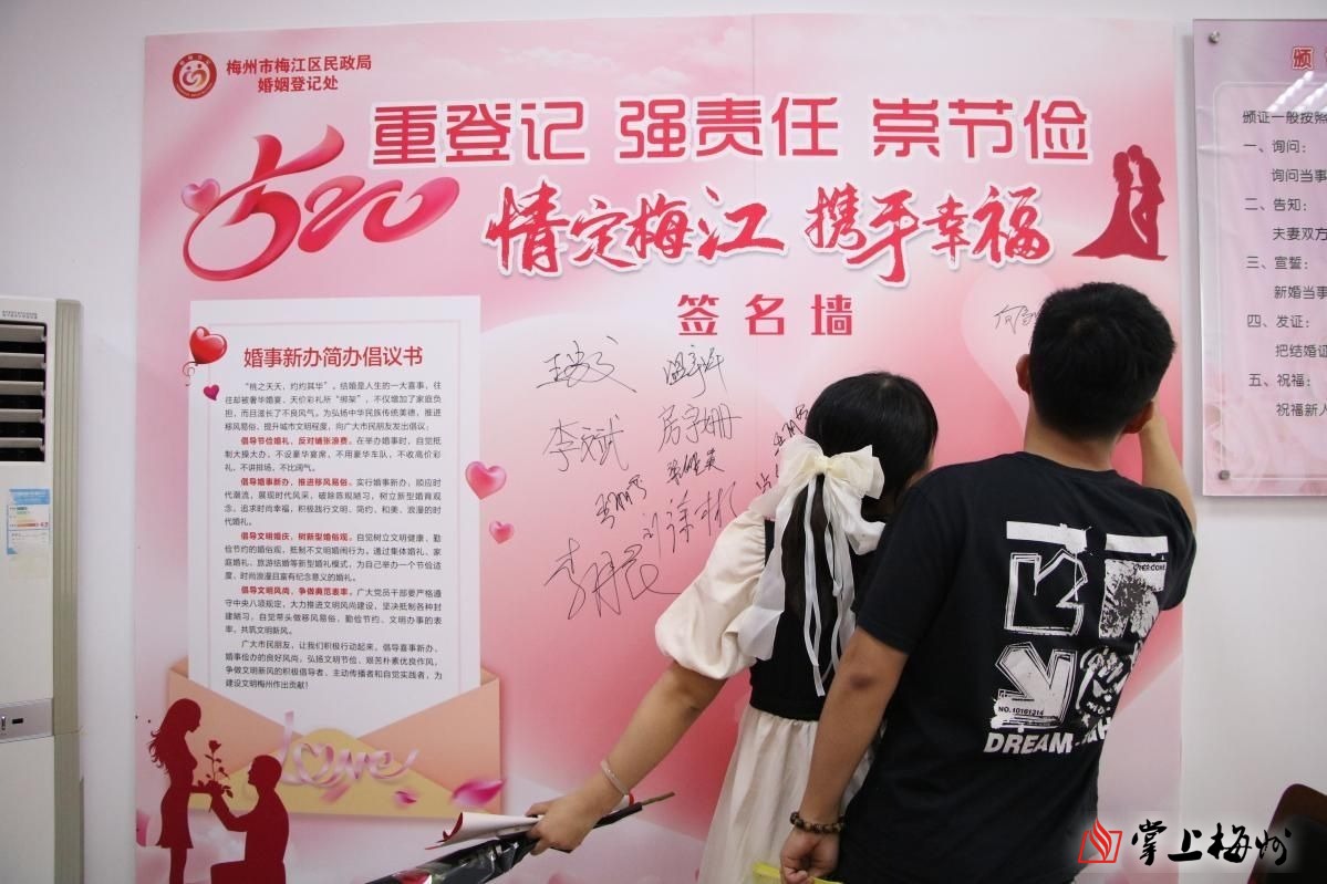 现场,区民政局婚姻登记处为新人免费提供拍摄照片志愿服务和颁证服务,新人在工作人员的指导下填写资料,庄严地宣读结婚誓词,并在婚事新办简办的倡议书签名墙上写下对婚姻的美好憧憬和郑重承诺,随后到“大型双喜”“想你的风吹到了梅州”“我在嘉应古城5街20巷等你”等甜蜜拍照区定格美好时刻,每对新人脸上洋溢着期待、幸福的笑容。区民政局婚姻登记处志愿者还为前来办理结婚登记的新人发放了《婚事新办简办倡议书》《民法典》等与婚姻家庭相关的宣传手册。